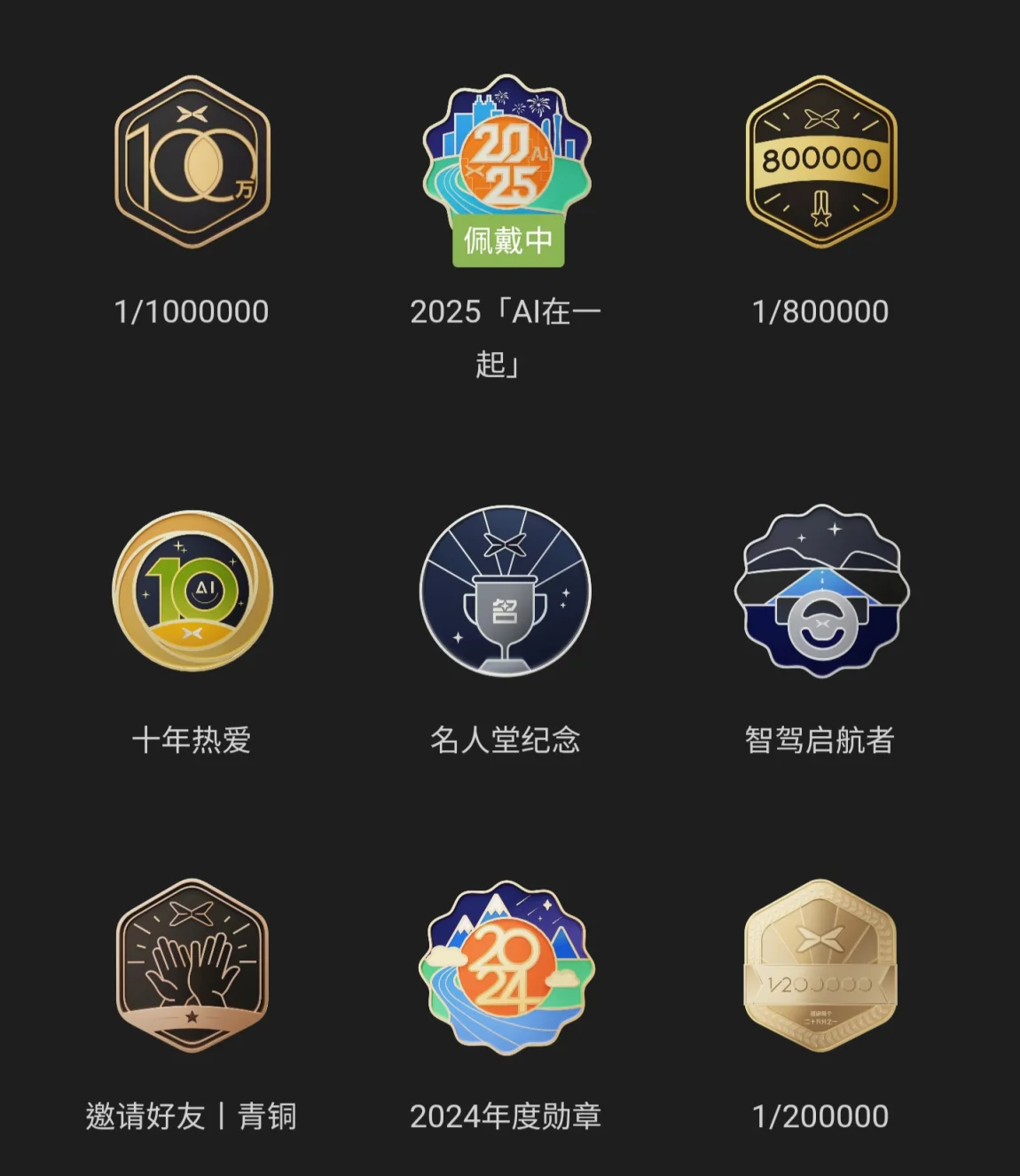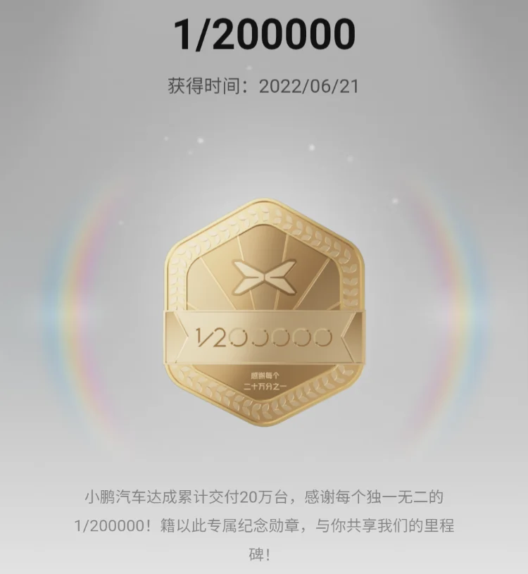 还记得我的首枚勋章,是在 2022 年 6 月 21 日点亮的【1/200000】。当时小鹏累计交付 20 万台,我很荣幸成为了其中的二十分之一。