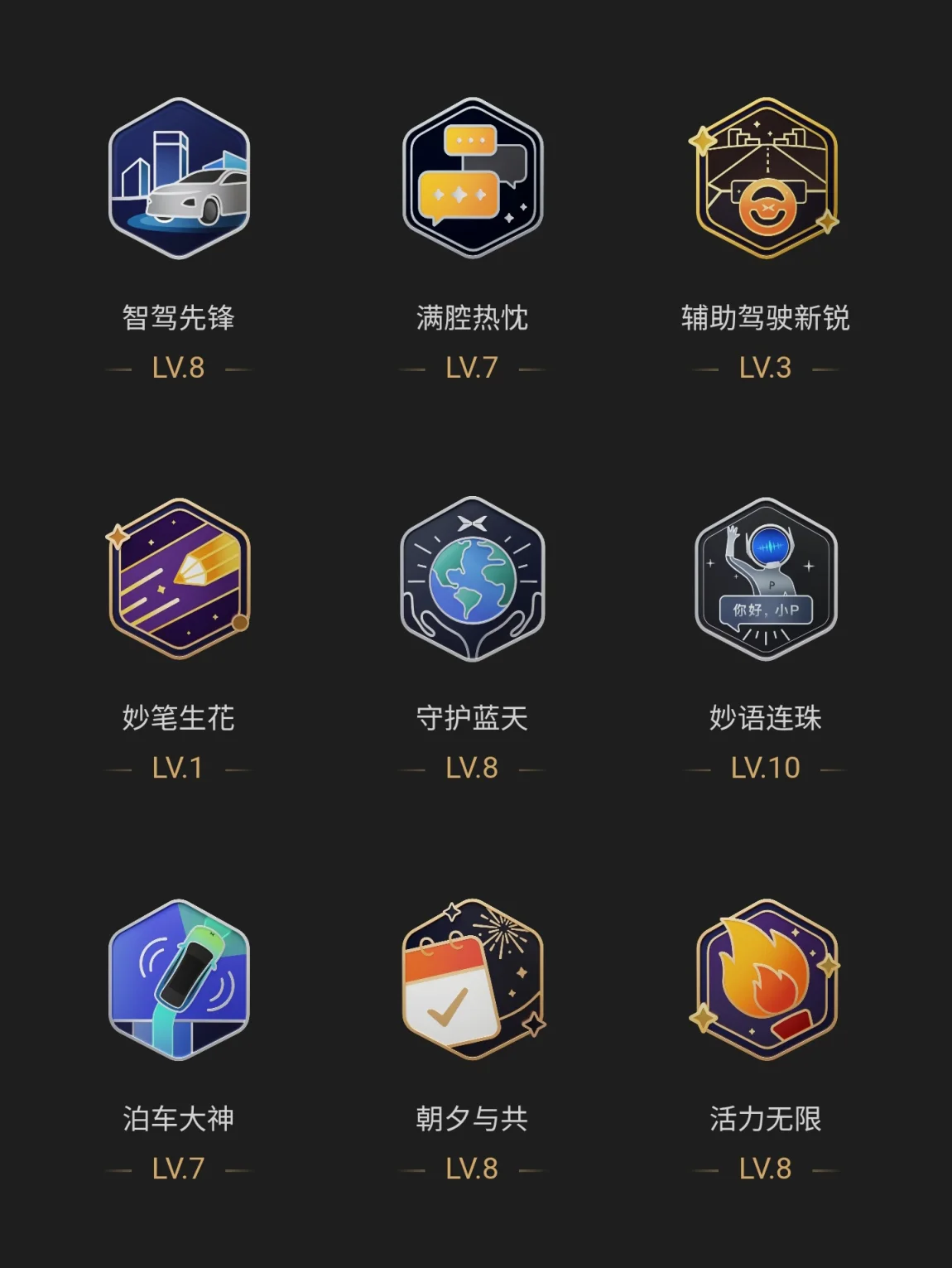 不知不觉,我已经点亮了 22 枚小鹏勋章啦!看着这些五颜六色的徽章,感觉就像看着自己的一部“车主成长史”。