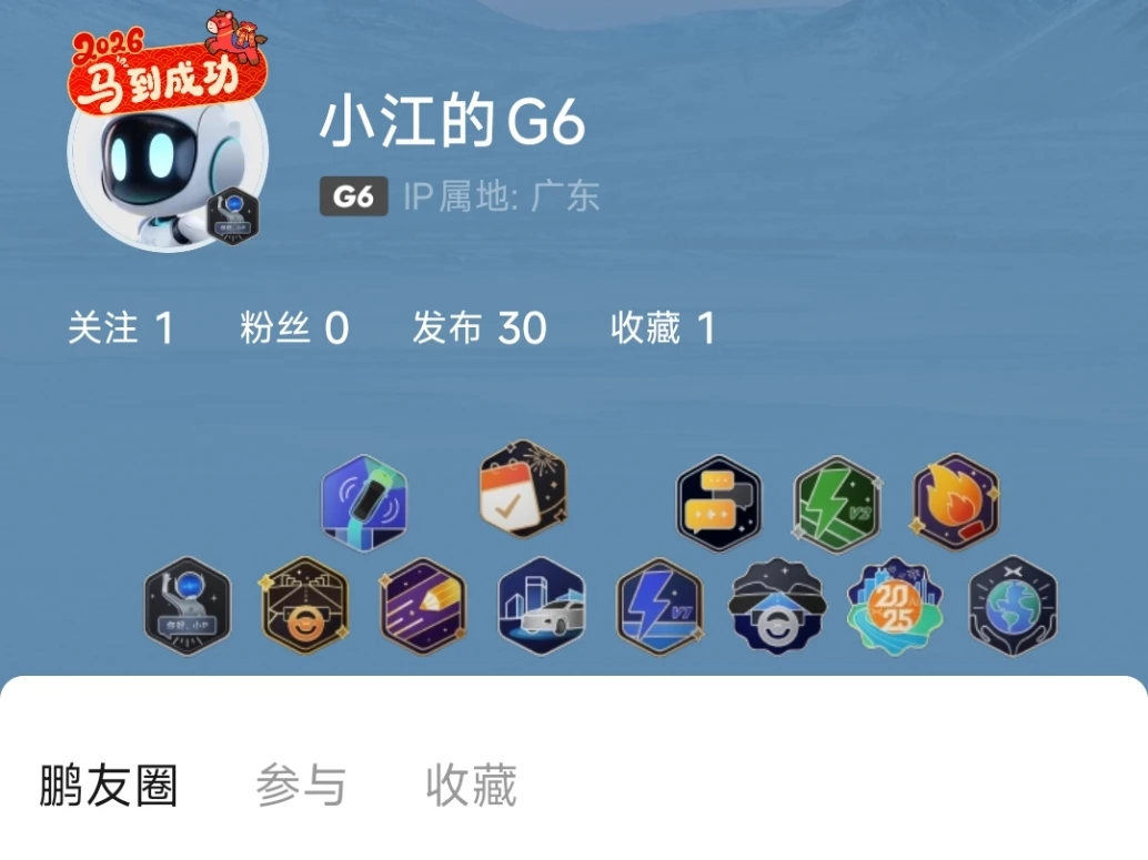 作为一名热衷参与 #鹏友共创# 的小鹏 G6 车主,今天翻开社区勋章墙,看着 13 枚熠熠生辉的荣誉徽章,心里满是踏实的欢喜与骄傲。从第一次解锁充电先锋勋章,感受家乡充电桩网络的便捷;到拿下智驾启航者与辅助驾驶新锐,在山路与城区街巷里,体验智驾系统带来的从容与安心;再到凭借文字与影像收获妙笔生花,如今佩戴着等级最高的妙语连珠 lv.4勋章,每一枚勋章都不是冰冷的标识,而是我与小鹏 G6 并肩走过的时光印记。
