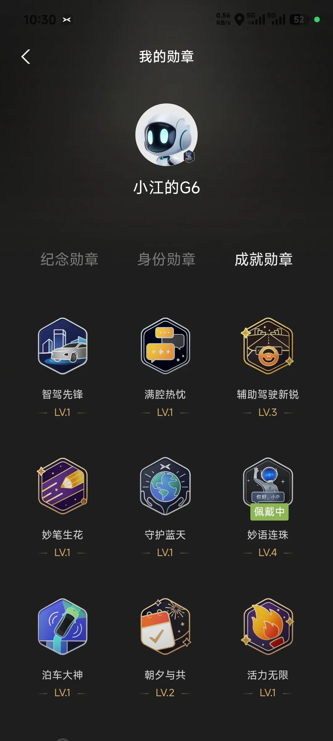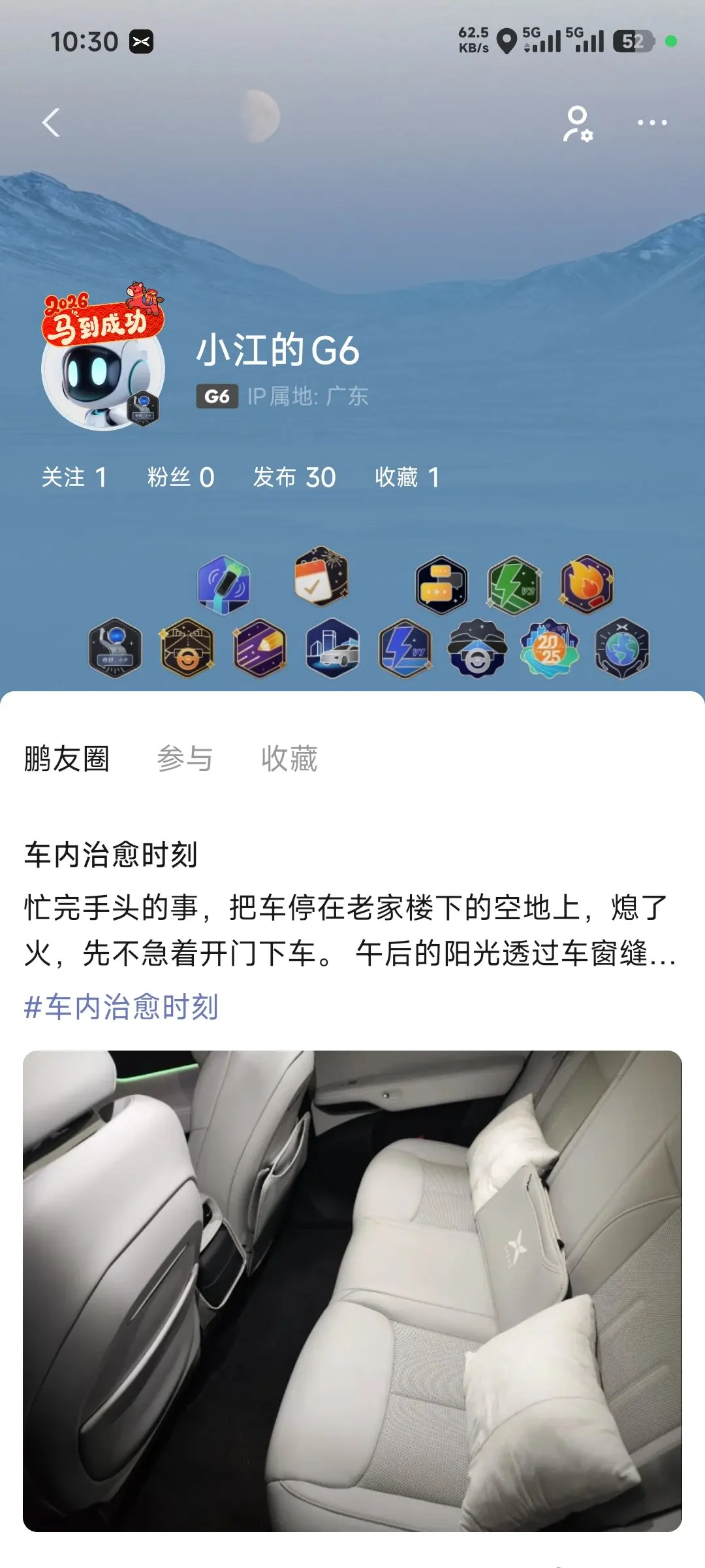 我总爱开着 G6 去赴春日之约,穿梭在春日暖阳里,用镜头记录沿途风景,用文字分享驾驶感受,而勋章墙就是这份生活的 “见证册”。13 款勋章覆盖了出行、智驾、创作等多个维度,早已成为我车主身份的独特印记。