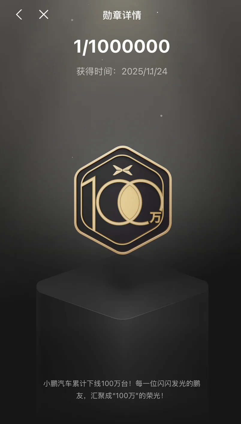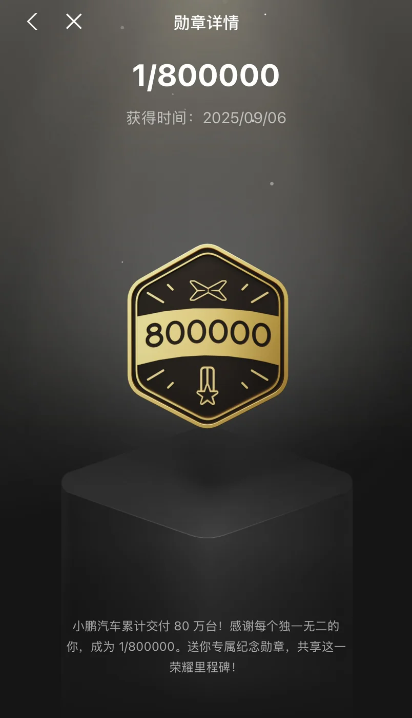 很荣幸,成为小鹏80万、再到百万车主中的一员。从一台车到一个大家庭,从一份选择到一种信仰,数字的背后,是千万鹏友的同行,是中国智造的底气。这两枚勋章,是小P、GOGO、PENGPENG为我加冕的荣耀,也是我与小鹏共同见证的里程碑。