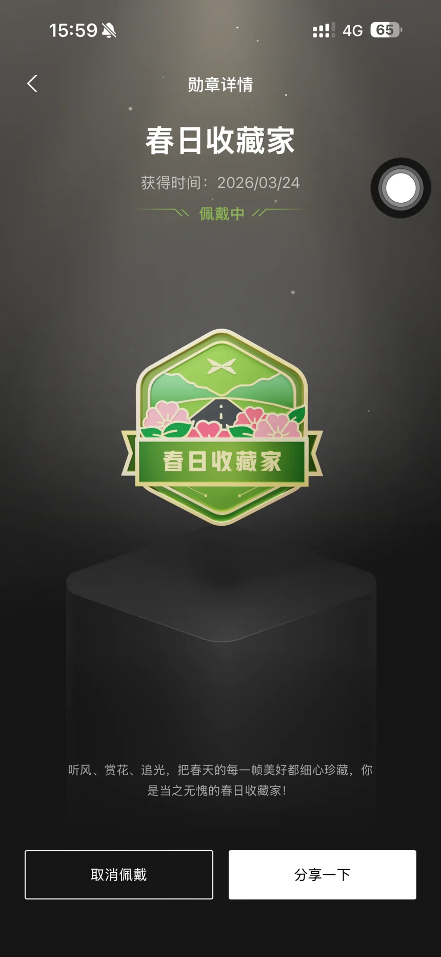 最新获得的这个春日收藏家勋章,就是我花了不少经历取得的。本来春日鉴赏的五个活动感觉挺多的,好像还完成不了,一开始没有想要发帖,后来看到还可以获得勋章,就尝试着发了些鹏友圈,一不小心还凑齐了五篇。
