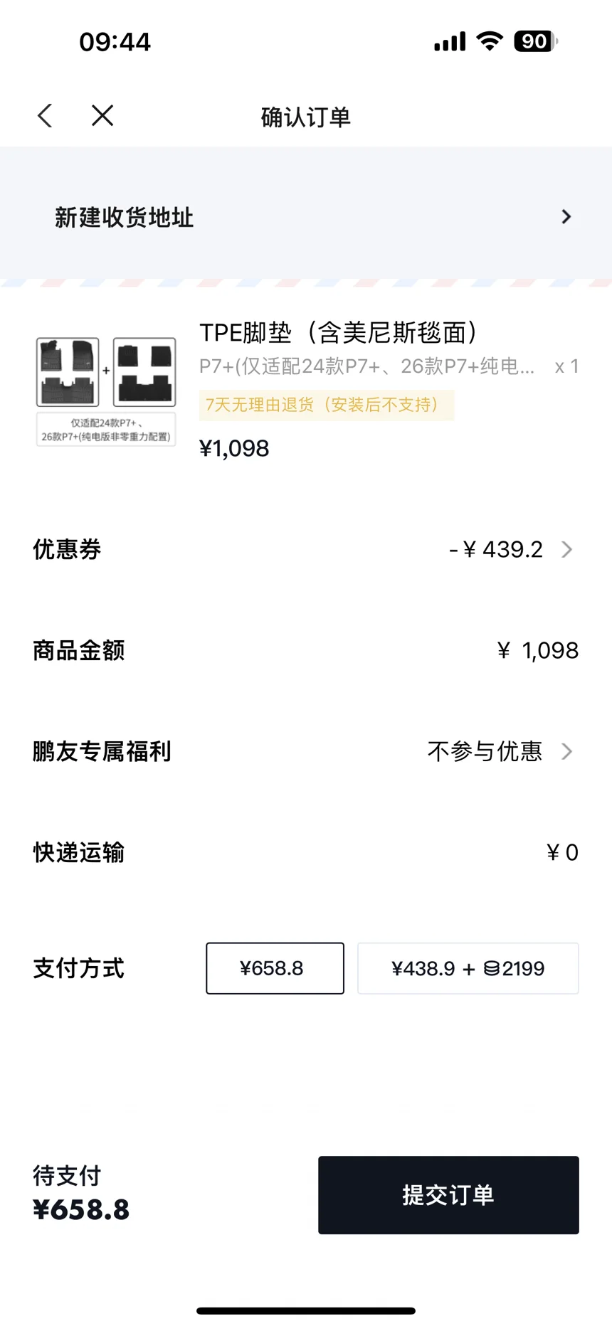 提车后选了好久的脚垫,淘宝买了一个TPE的,梆硬梆硬的,立马就退了,后来发现小鹏商城的3w,因为有新车主6折券,比其他平台购买要便宜很多。