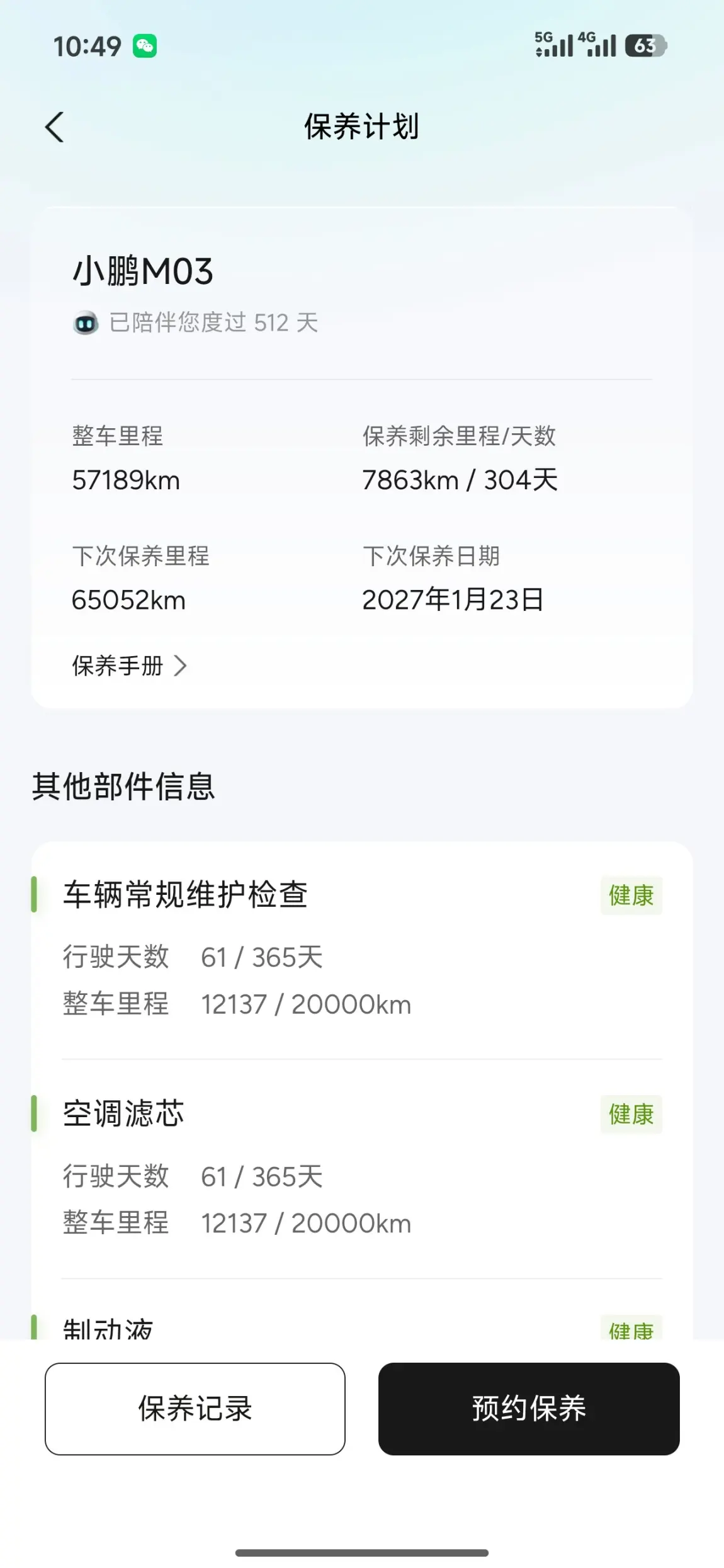 不知不觉,我的小鹏MONA 03已经陪伴我512天,行驶57189km。系统清晰展示保养计划,剩余7863km/304天就到下次保养,空调滤芯、制动液等部件状态也一目了然。智能提醒让我不用费心记里程,只管安心开,售后体验拉满💯