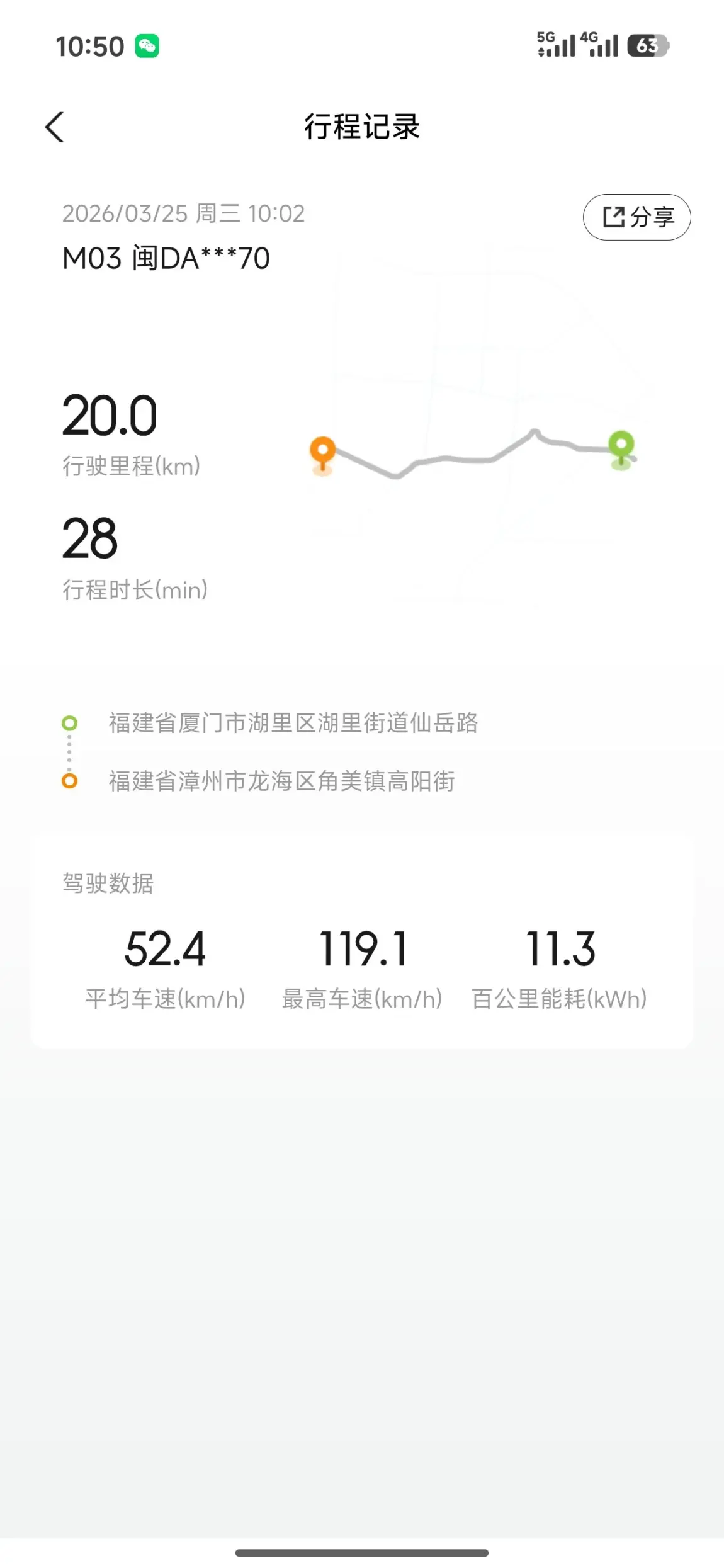 今天从漳州角美到厦门仙岳路,20km路程仅用28分钟,平均车速52.4km/h,百公里能耗低至11.3kWh。高速路段最高车速119.1km/h,电机输出平顺,动能回收也帮着省了不少电,这样的能耗表现让跨城通勤毫无压力。