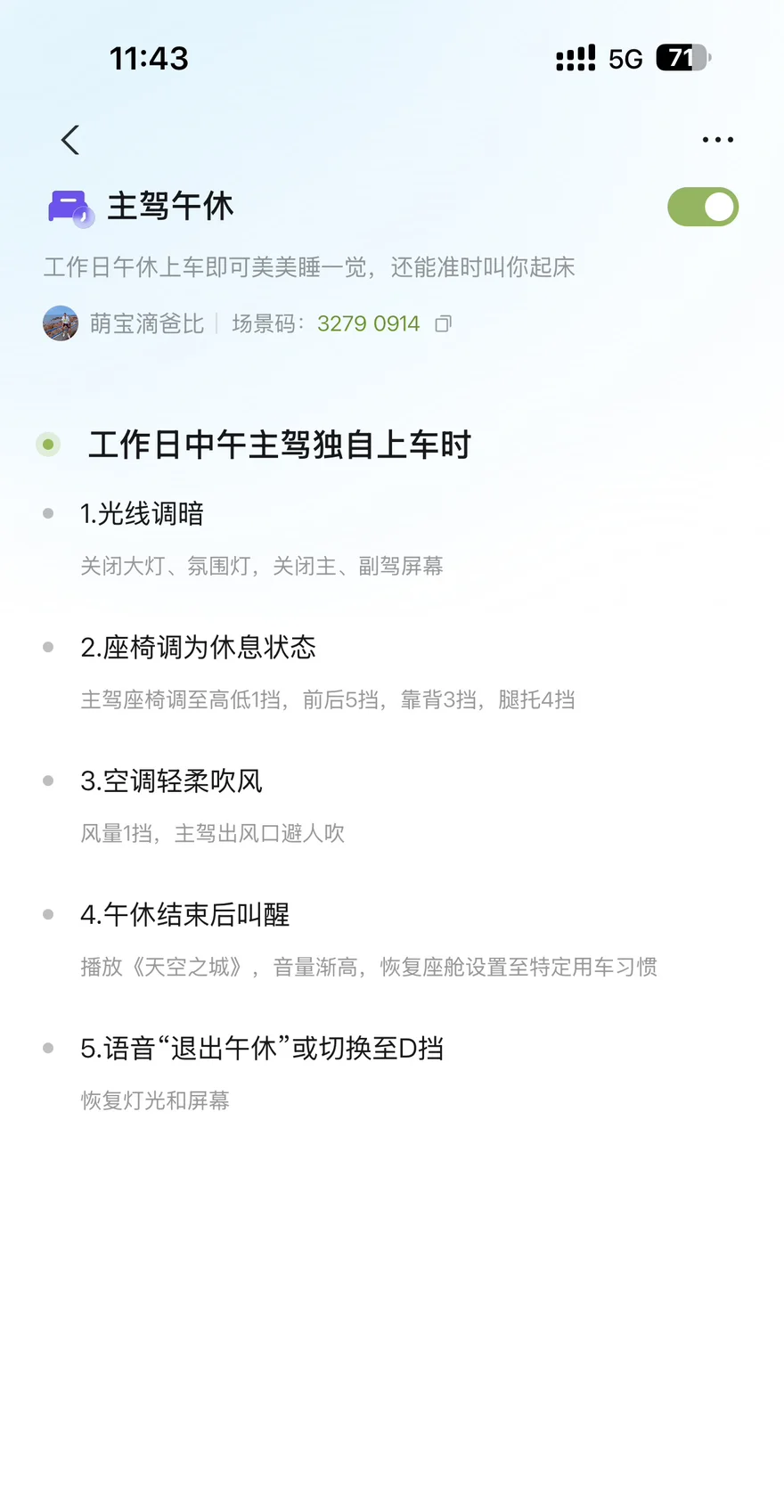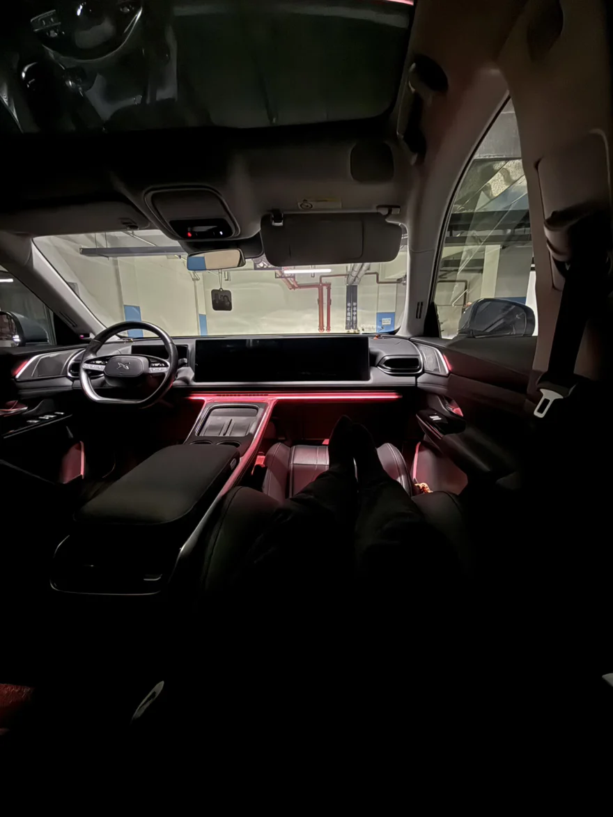 每天中午下班赶回家太折腾,我就直接把车停在公司周围的地下车库。提前设置好「主驾午休」场景,上车后座椅自动放倒成舒适躺姿,空调调到25℃,氛围灯切换成温柔的暖黄色,连车窗都自动升起隔绝噪音。不得不说小鹏隔音真的不错....
