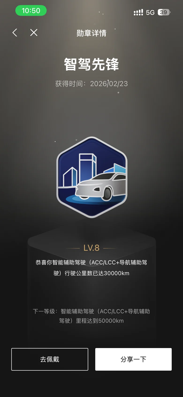 全球首款Ai智能轿跑,是吸引我买车的原因。从一开始对智驾的不熟悉,小心翼翼,到后来如臂驱使。到现在为止我总共开了四万三千公里,这枚8级勋章就是最好的见证。
