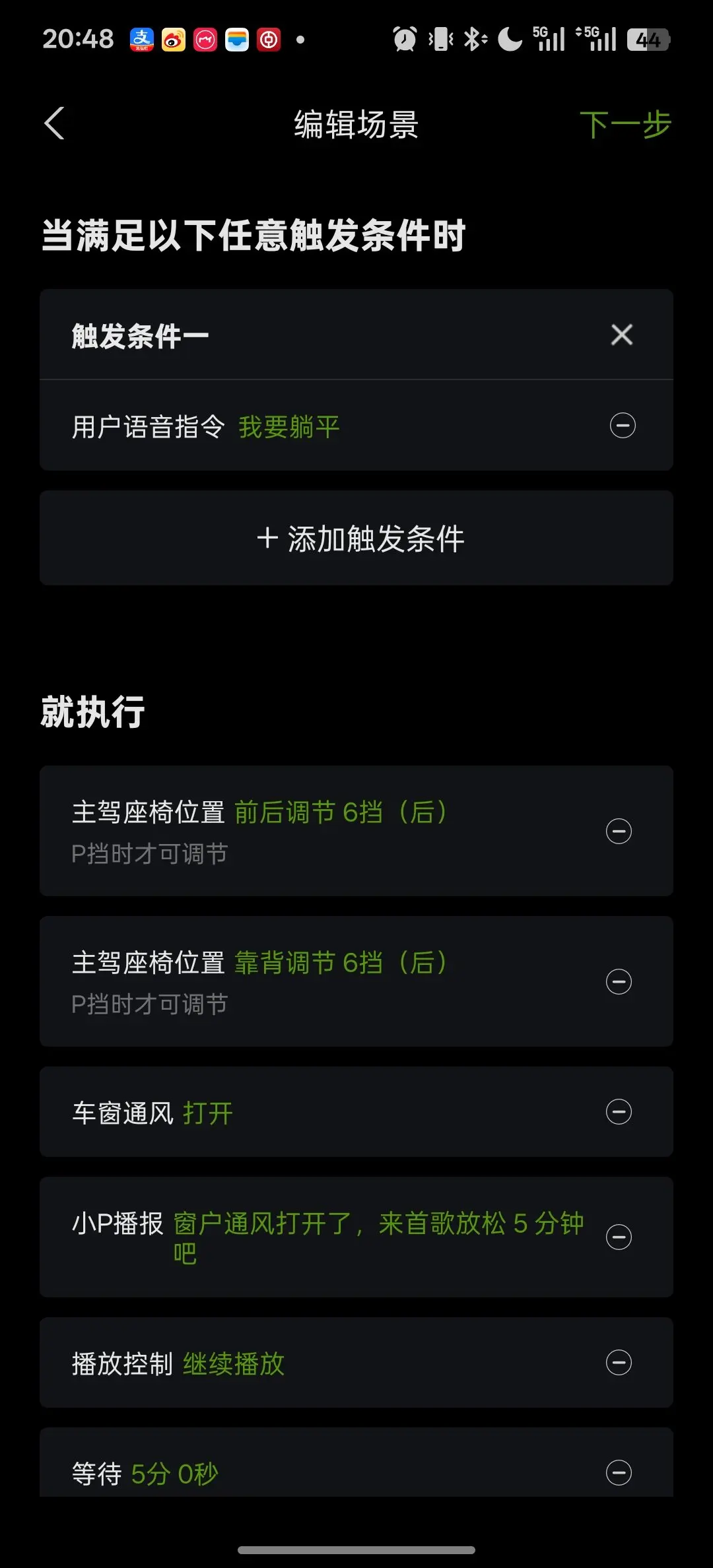 但在车里,在停车后的10来分钟。我可以选择躺平,为此我专门做了一个智慧场景"我要躺平",一句”你好,小p,我要躺平。"便执行了座椅的調节,人便舒舒服服躺着。