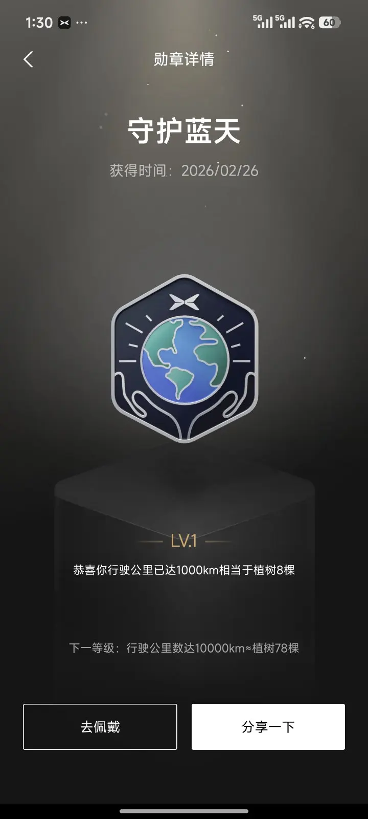 首枚勋章是「守护蓝天」,在2月26日获得,这是我成为小鹏车主后收获的第一份纪念,也代表着我选择绿色出行的初心。