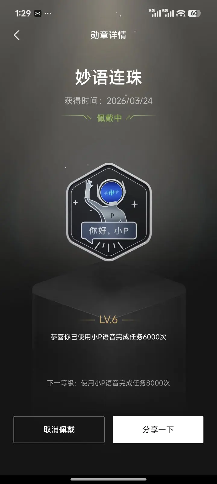 提车还不足60天,我已经呼叫小P超过600次,平均每天差不多10次!所以现在最常佩戴的是「妙语连珠」勋章,它见证了我和小P的高频互动,每次唤醒都觉得特别亲切。