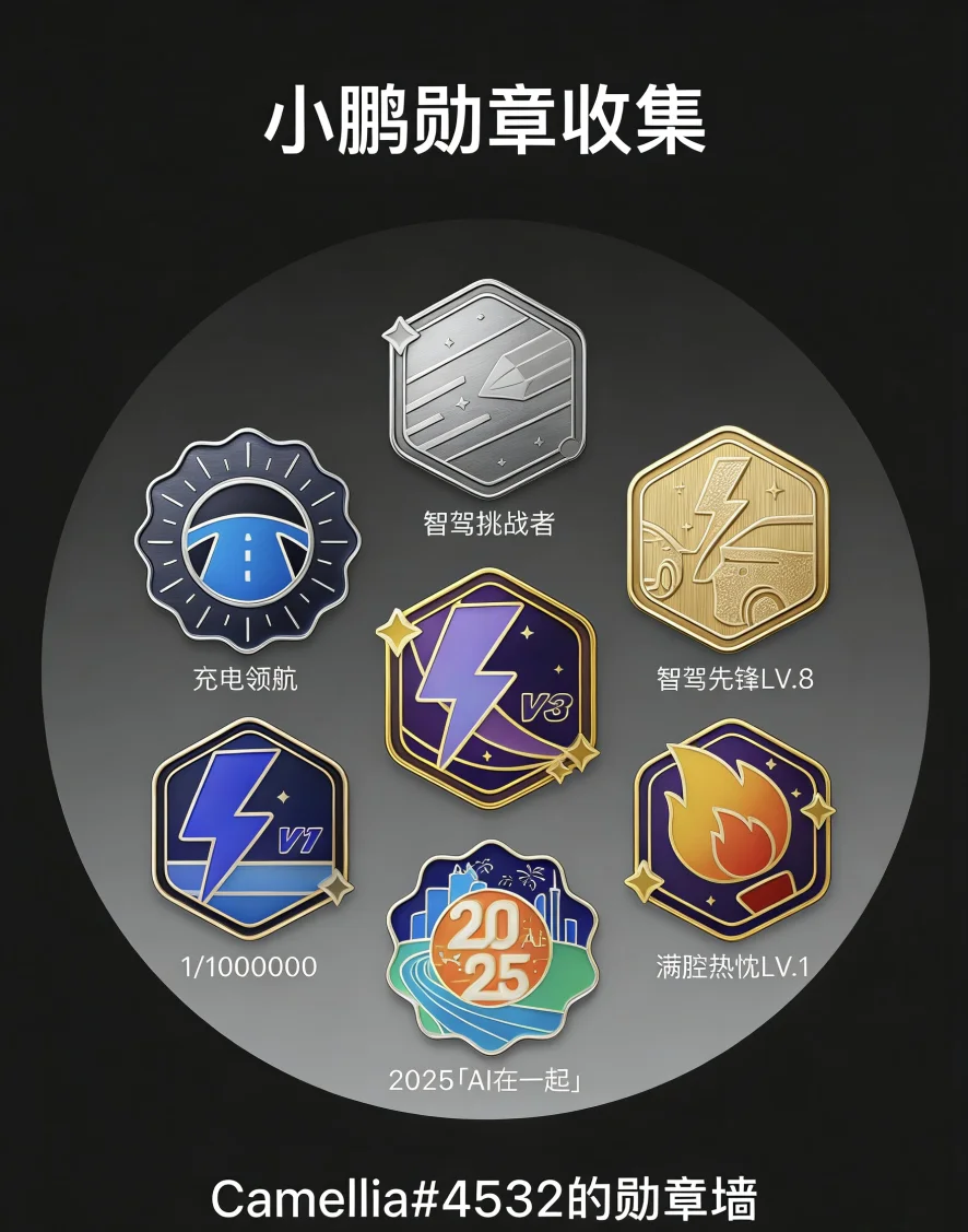 当然也有小遗憾,好多限定勋章因为各种原因错过了,真的太希望官方能安排返场,让我们这些后入坑的鹏友也能补齐回忆。也期待未来能有更多和新车、新功能绑定的勋章,让我们能收集更多和小鹏的专属记忆,要是有实体勋章就更好啦~#晒晒我的勋章#
