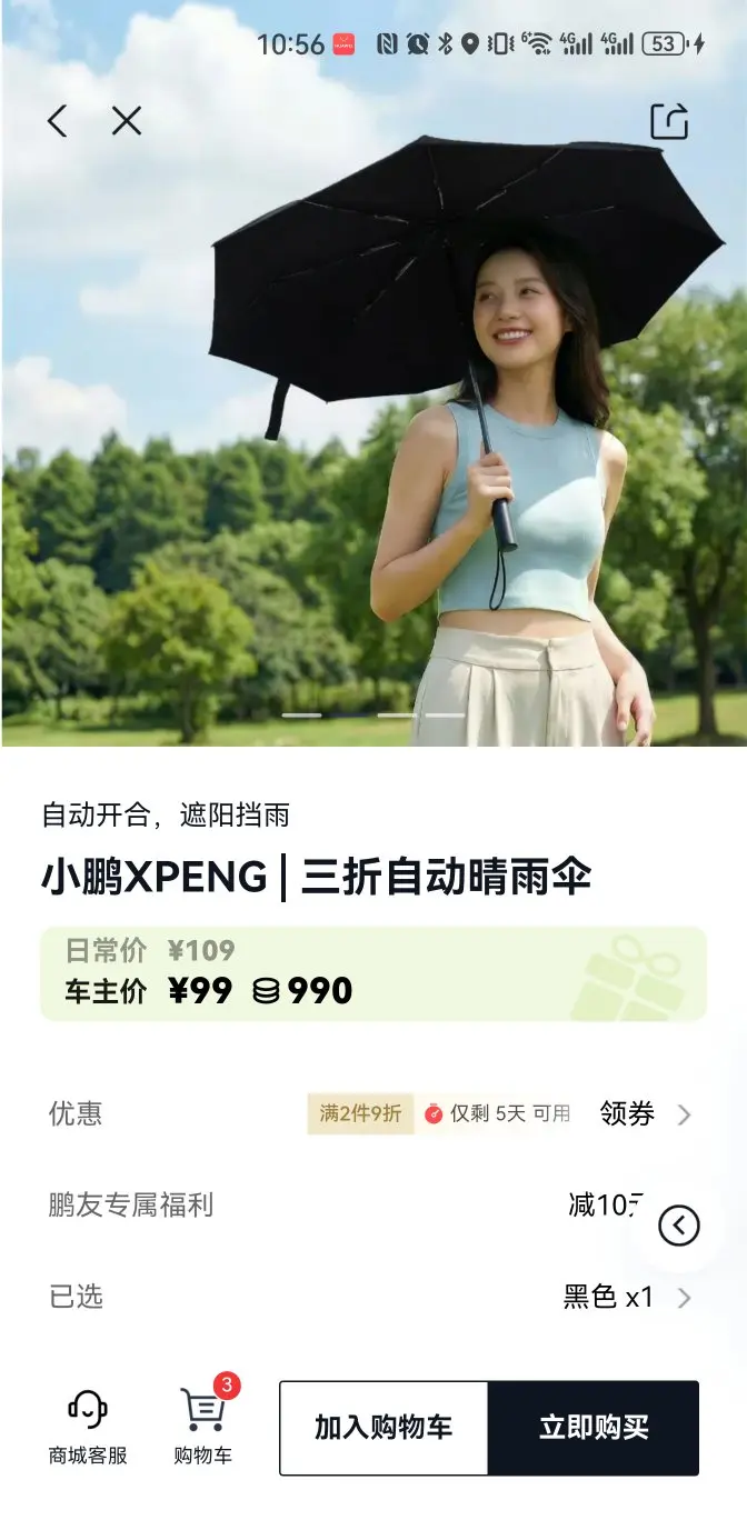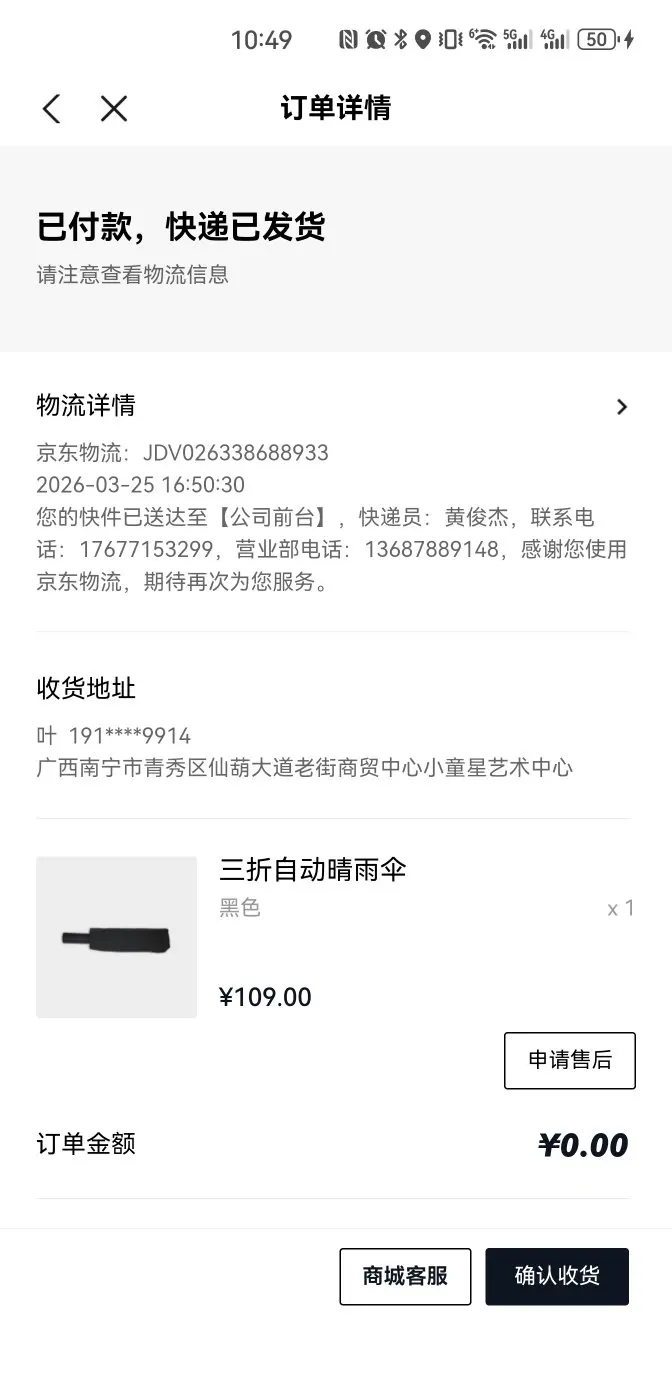 这款晴雨伞是我上周刚入手的,黑色简约款,自动开合设计简直为车主量身打造!原价109元,我用积分兑换后相当于零元购,订单显示已发货,物流超快,京东直接送到公司前台。作为南宁人,雨季频繁,以前上下车总被淋湿,现在这把伞小巧便携,折叠后随手塞车门槽,下雨时一按即开,再也不用狼狈收伞。而且材质轻便防风,实用度满分,绝对是南方车主的刚需神器!