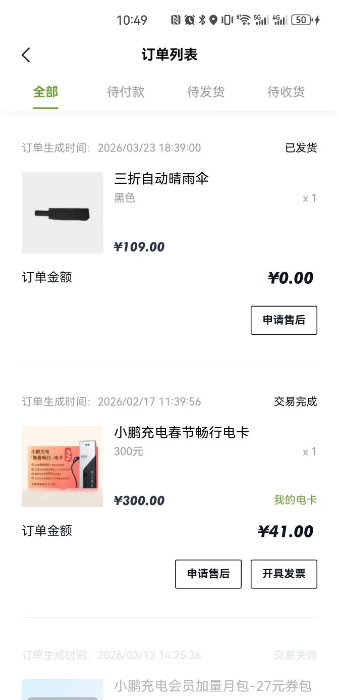除了配件,充电卡也是我的私藏好物!订单列表里我还买过春节畅行电卡,300元面值实付41元,性价比爆表。平时用会员券包也能省不少,这些虚拟好物让出行成本大降,配合实体装备,体验感拉满。虽然活动主要分享车载物品,但智慧能源管理也是小鹏车主的必修课哦~