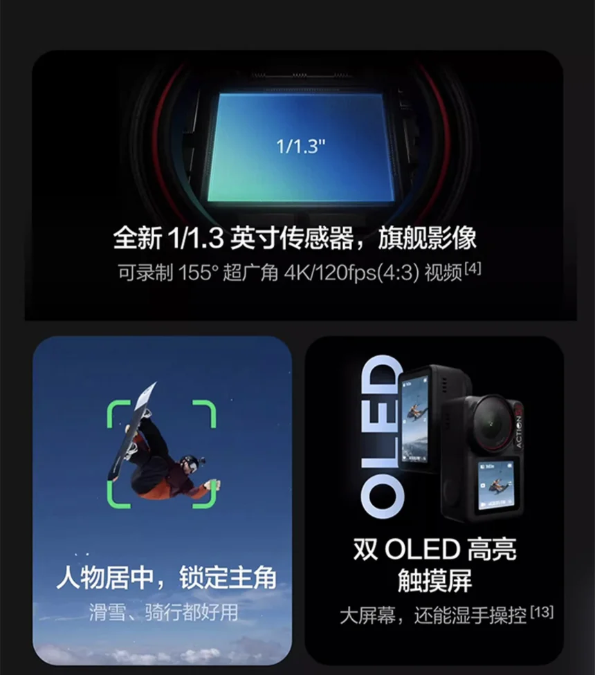 机身设计延续了大疆运动相机的经典风格,前后双OLED高亮触摸屏是最大亮点之一。主屏峰值亮度提升至1000 cd/m²,即使在强光下也能清晰查看画面。屏幕尺寸加大,边框更窄,屏占比提高了16%。