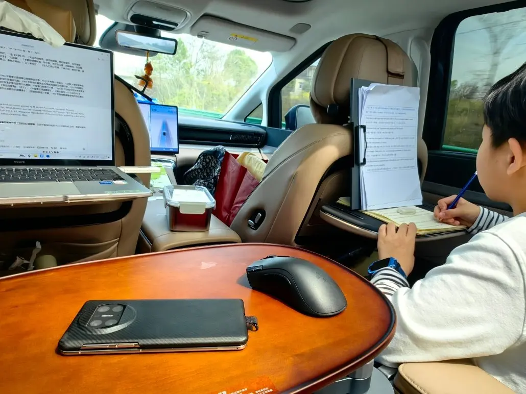 一边是娃安安稳稳坐在后排小桌板前写作业,笔尖不晃、思路不飘,沉浸式赶作业完全不耽误;