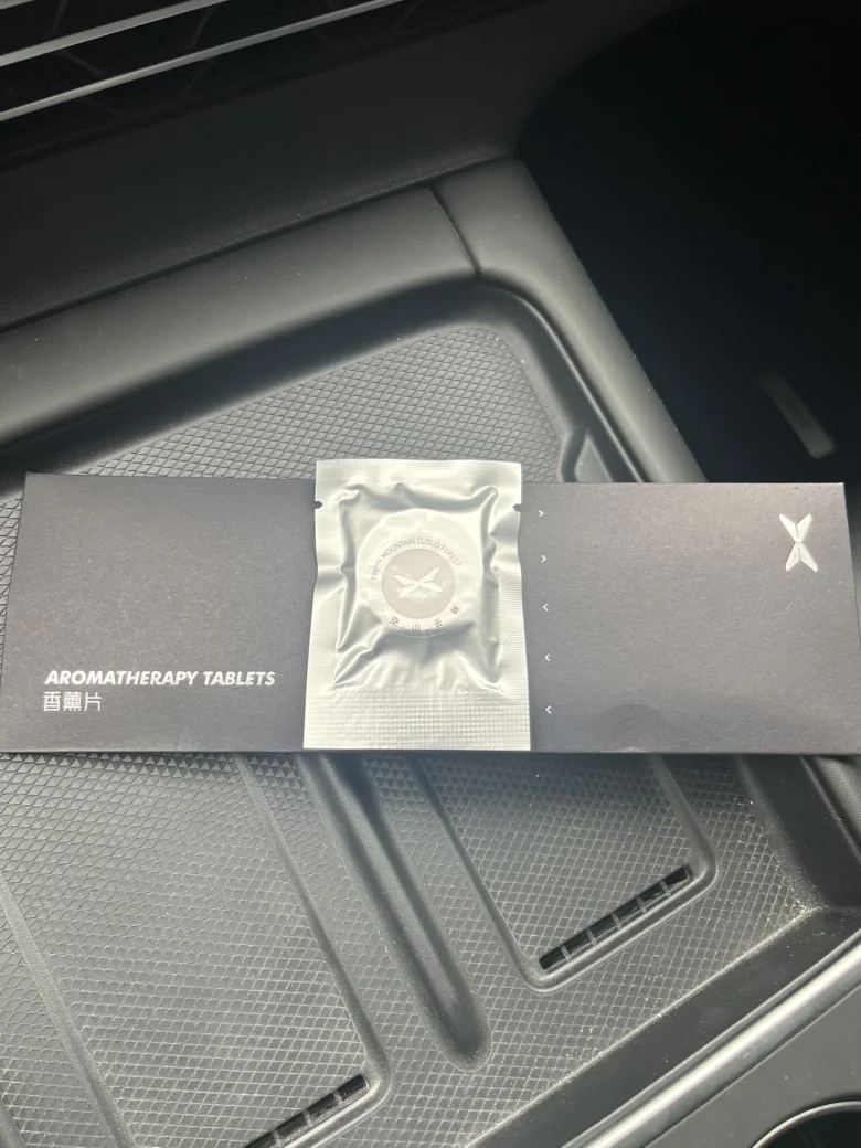 车载香薰采用小鹏汽车座椅Nappa真皮余料制作,环保再利用,外观为全铝合金超薄磁吸盒,背面带有小鹏轮毂标志,兼顾质感与环保。
