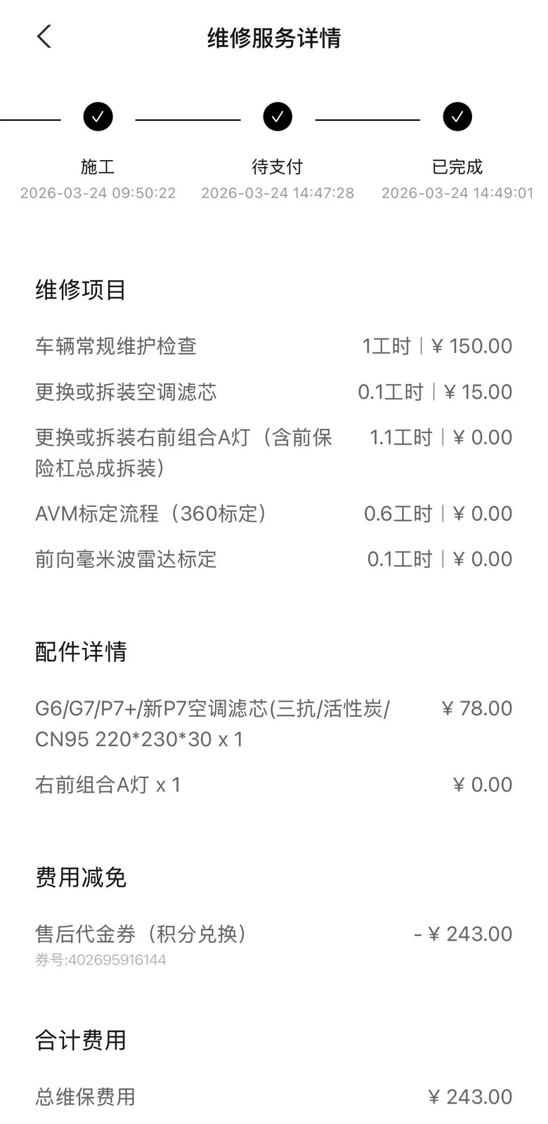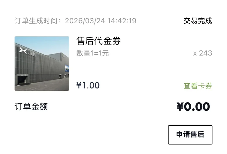 售后代金劵,覆盖全车保养、维修、钣金等所有售后场景,不管是常规保养还是小磕小碰,都能直接抵扣,稳稳省下一笔真金白银,有积分的鹏友别忘记抵扣哦。