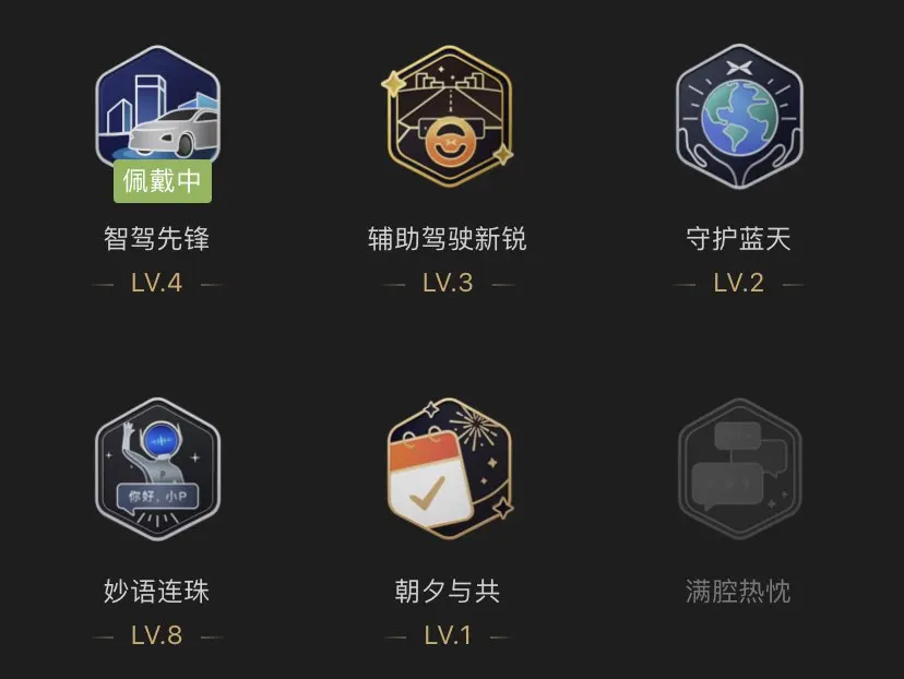 • 成就勋章:智驾先锋(LV.4,佩戴中)、辅助驾驶新锐(LV.3)、守护蓝天(LV.2)、妙语连珠(LV.8)、朝夕与共(LV.1)