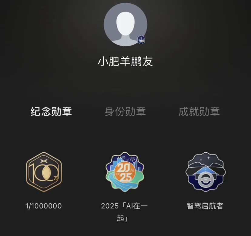 • 纪念勋章:1/1000000、2025「AI在一起」、智驾启航者、1/800000