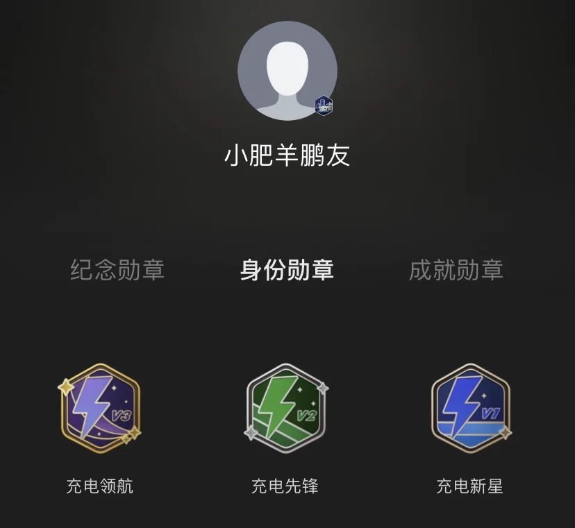 • 身份勋章:充电领航、充电先锋、充电新星