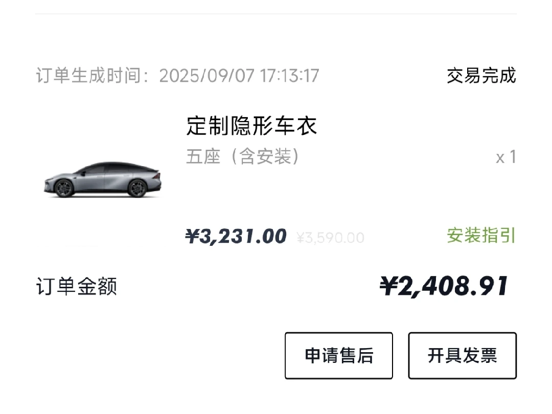 - 体验:新车落地第一件事就是贴车衣,选的小鹏官方定制款,贴合度拉满,没有翘边、气泡。日常小剐小蹭完全能扛住,跑高速防石子、停车防开门磕,半年下来车漆依旧锃亮,后期卖车也能多保值,性价比在线。