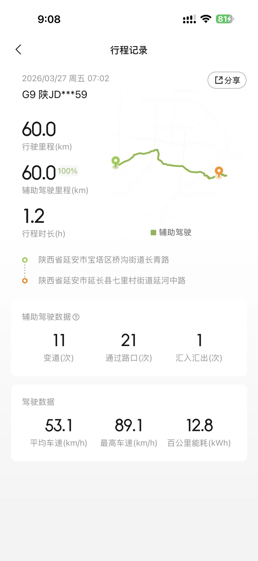 3.能耗表现太惊喜:全程近60公里,平均能耗仅12.8kWh/100km,在山区起伏路段还能保持这么低的电耗,G9的三电效率真的顶!完全不用为续航焦虑发愁。