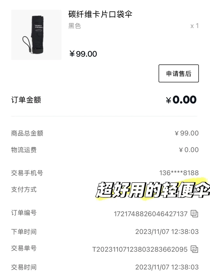 3.碳纤维口袋伞。非常轻便,随便一个旮旯里就能塞,出行的时候不管是放车上还是塞包里,都不会占用太多空间。而且,最最最厉害的是特别轻,小孩子都能一手举伞,放口袋犹如无物!