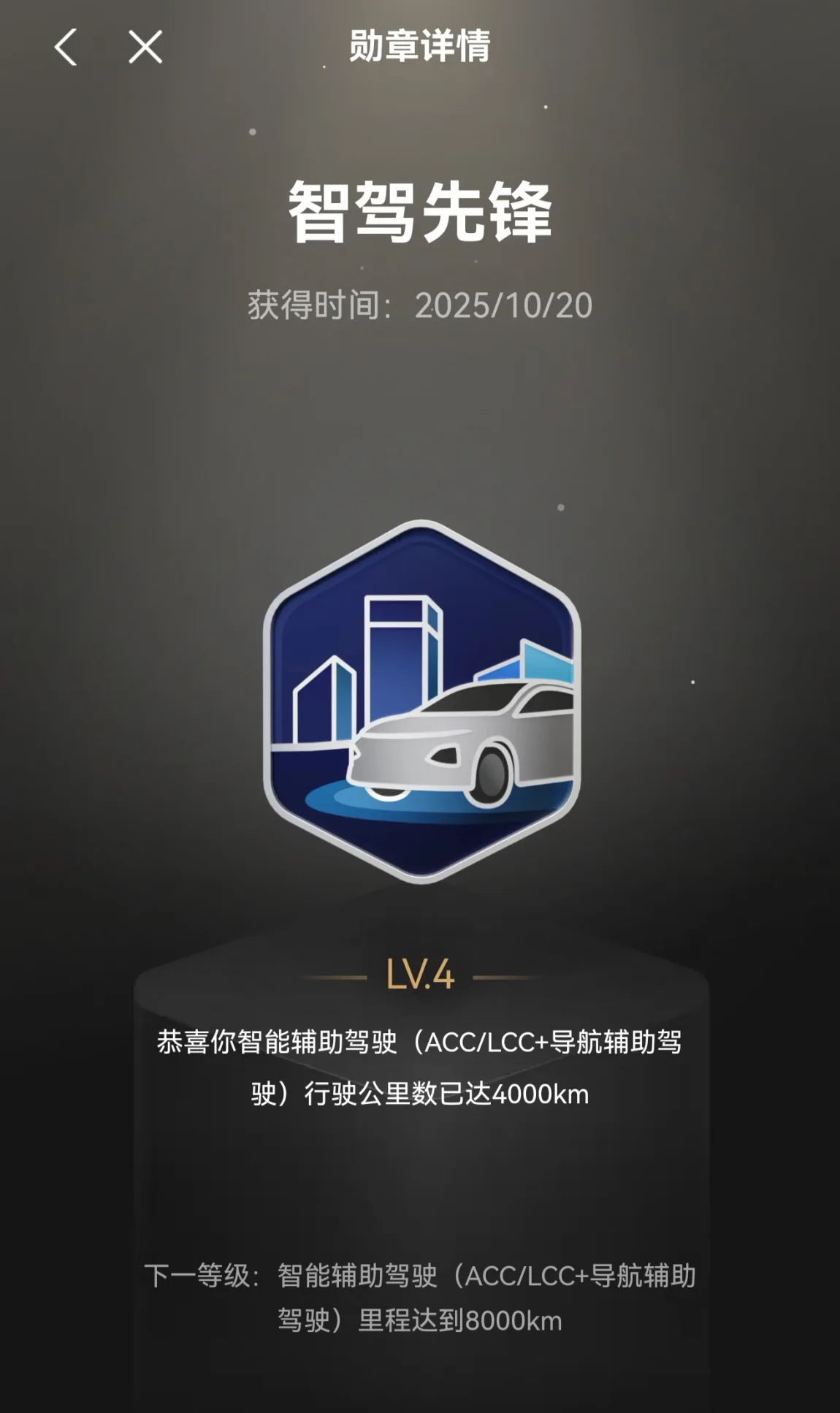 这是我最有成就感的一枚勋章。它见证了我从初次接触智能驾驶,到放心依赖、熟练使用辅助驾驶的全过程。高速从容、长途安心,每一公里智驾里程,都是对未来出行的真实体验。