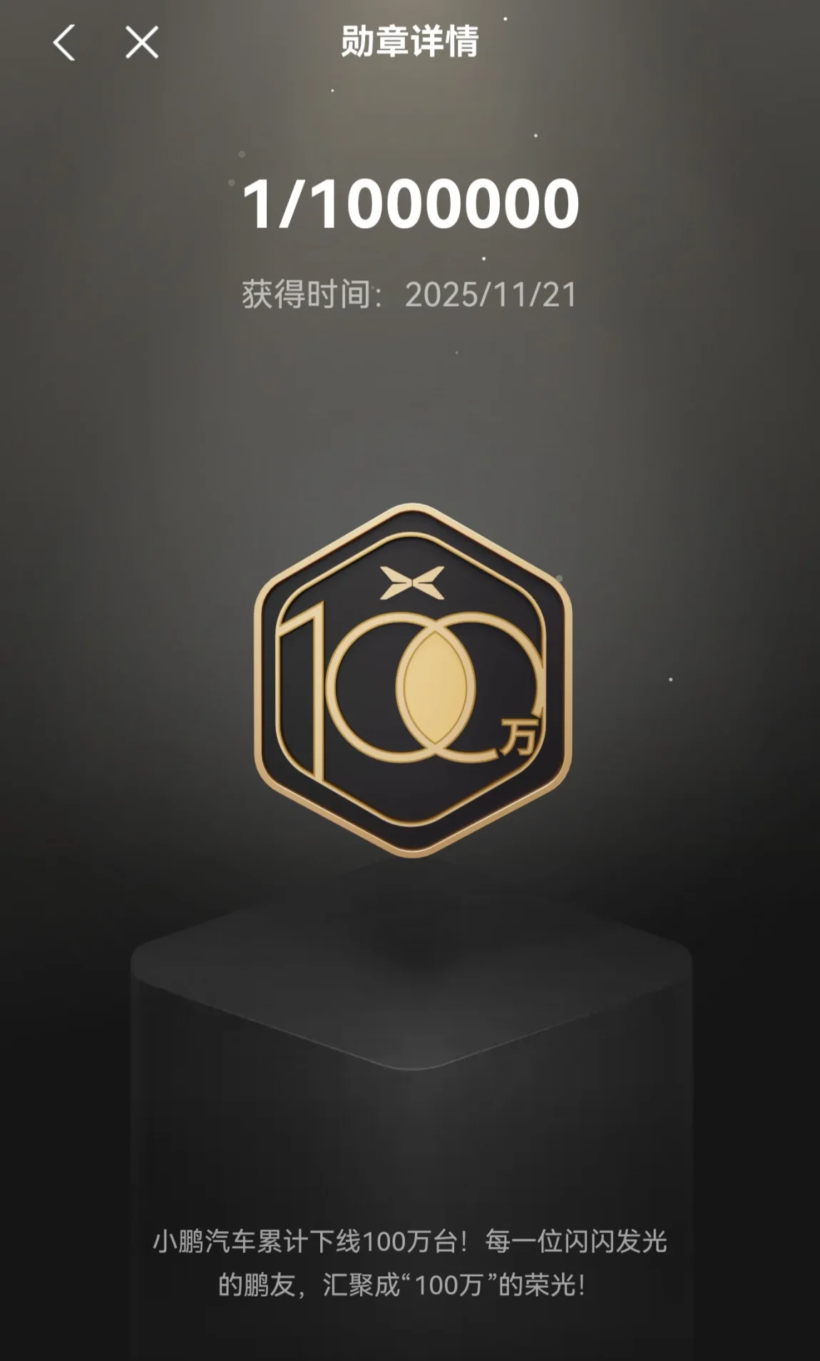 这是最有仪式感、最有归属感的一枚。作为小鹏第100万台整车下线的纪念勋章,它让我觉得自己不只是一位车主,更是品牌里程碑的亲历者与见证者。