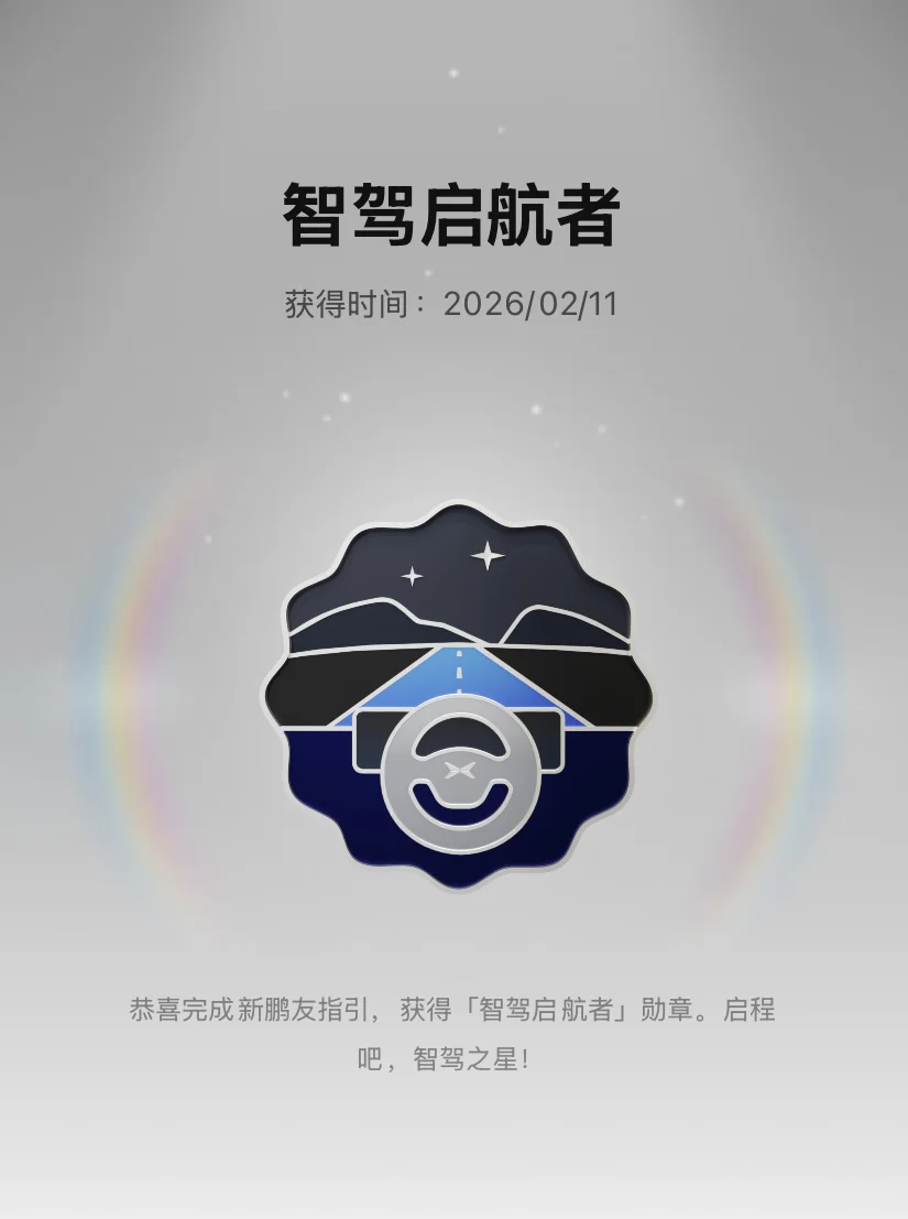 🏁 智驾启航者:这是我的第一枚勋章,完成新鹏友指引就解锁啦!它见证了我第一次解锁智驾功能的激动,就此正式开启了我的智驾生活,仪式感拉满~