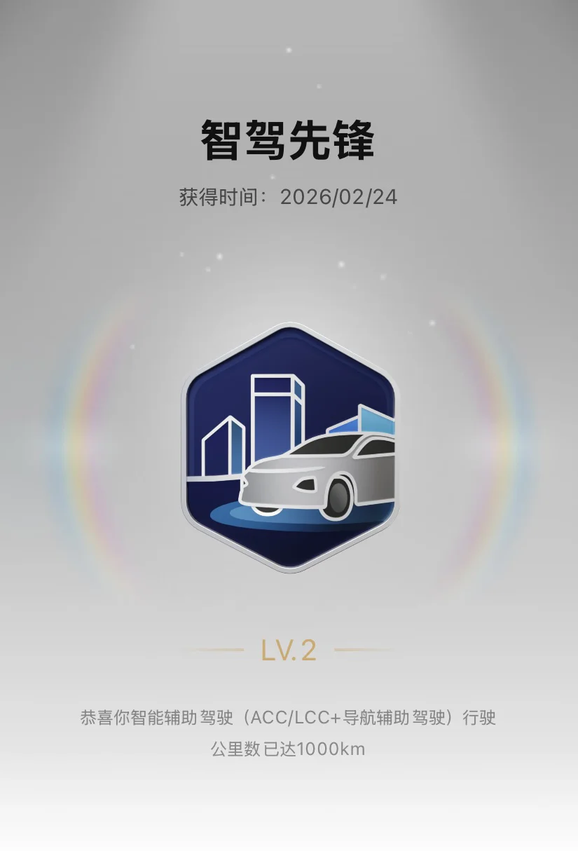 🚗 智驾先锋:智驾行驶满1000km的奖励!每次打开NGP解放双手都让我更信任小鹏的技术,这枚勋章是对我智驾习惯的最好肯定。