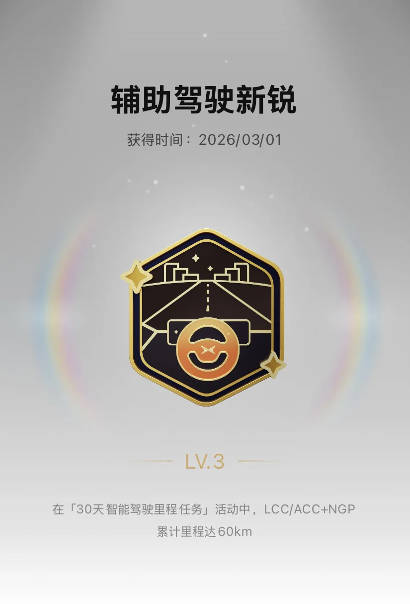 ✨ 辅助驾驶新锐:最青睐的一枚勋章,代表着我 30天智驾里程任务的成果,黑金配色超高级!完成60km NGP里程时特别有成就感,也让我更敢探索智驾的更多可能,期待未来能升到更高等级~