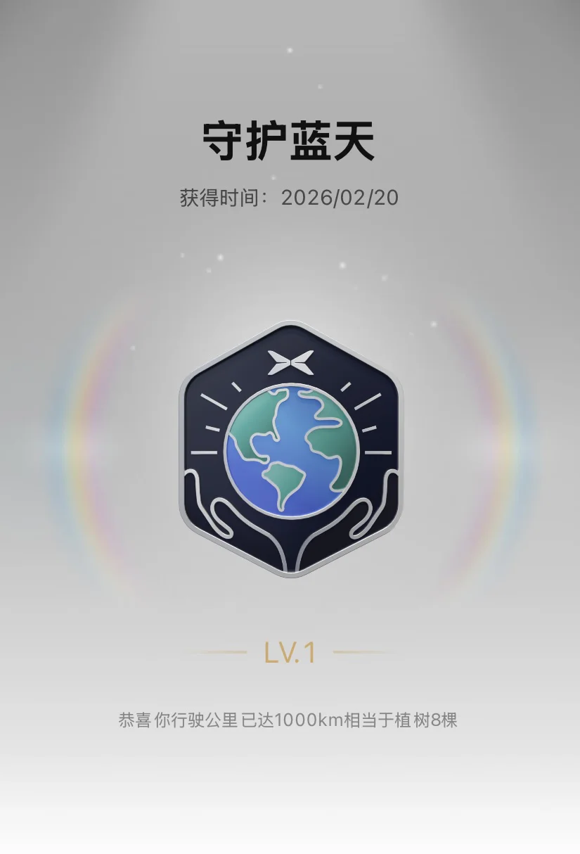 🌍 守护蓝天:行驶满1000km获得的勋章,行驶1000km相当于植树8棵,开着新能源车为环保出一份力的成就感,在拿到这枚勋章时瞬间拉满,原来日常出行也能悄悄守护地球。