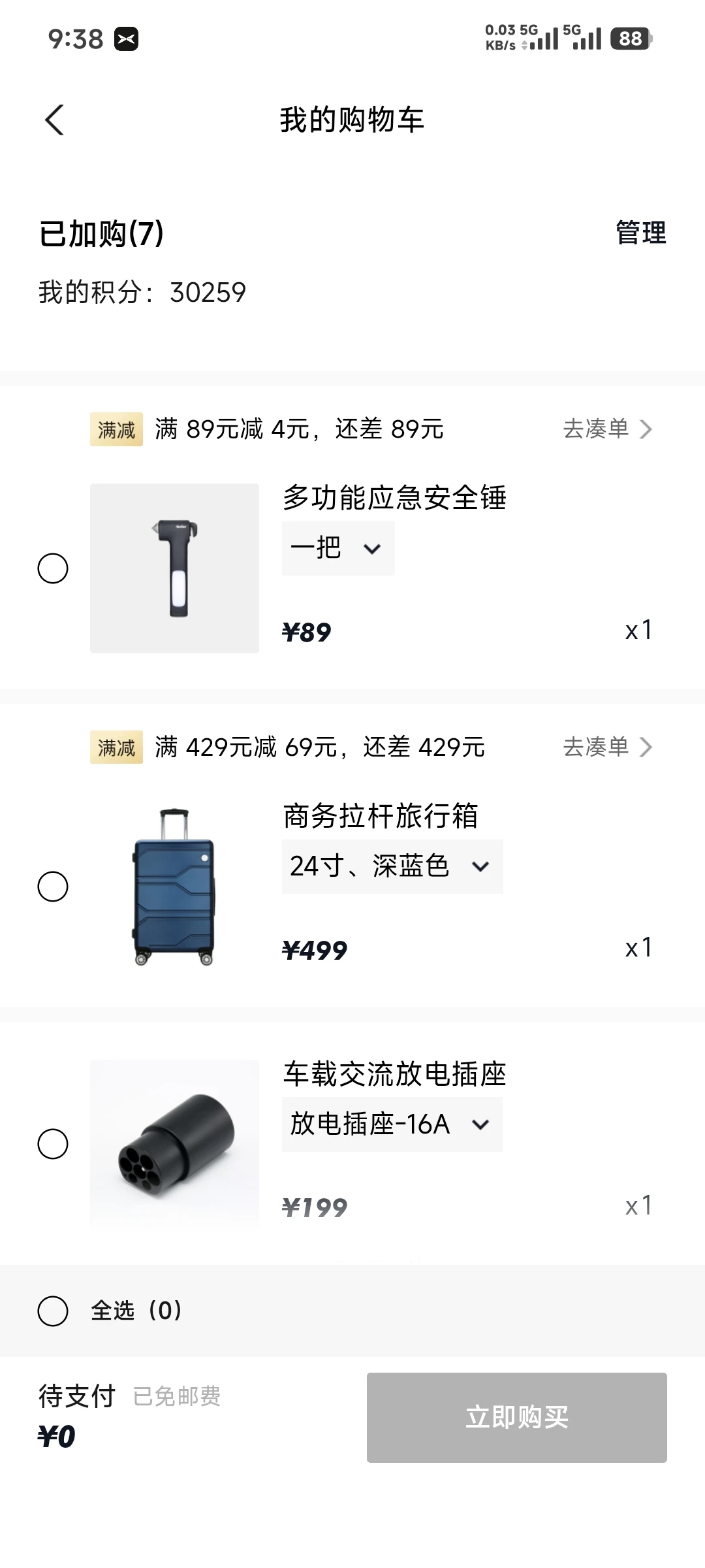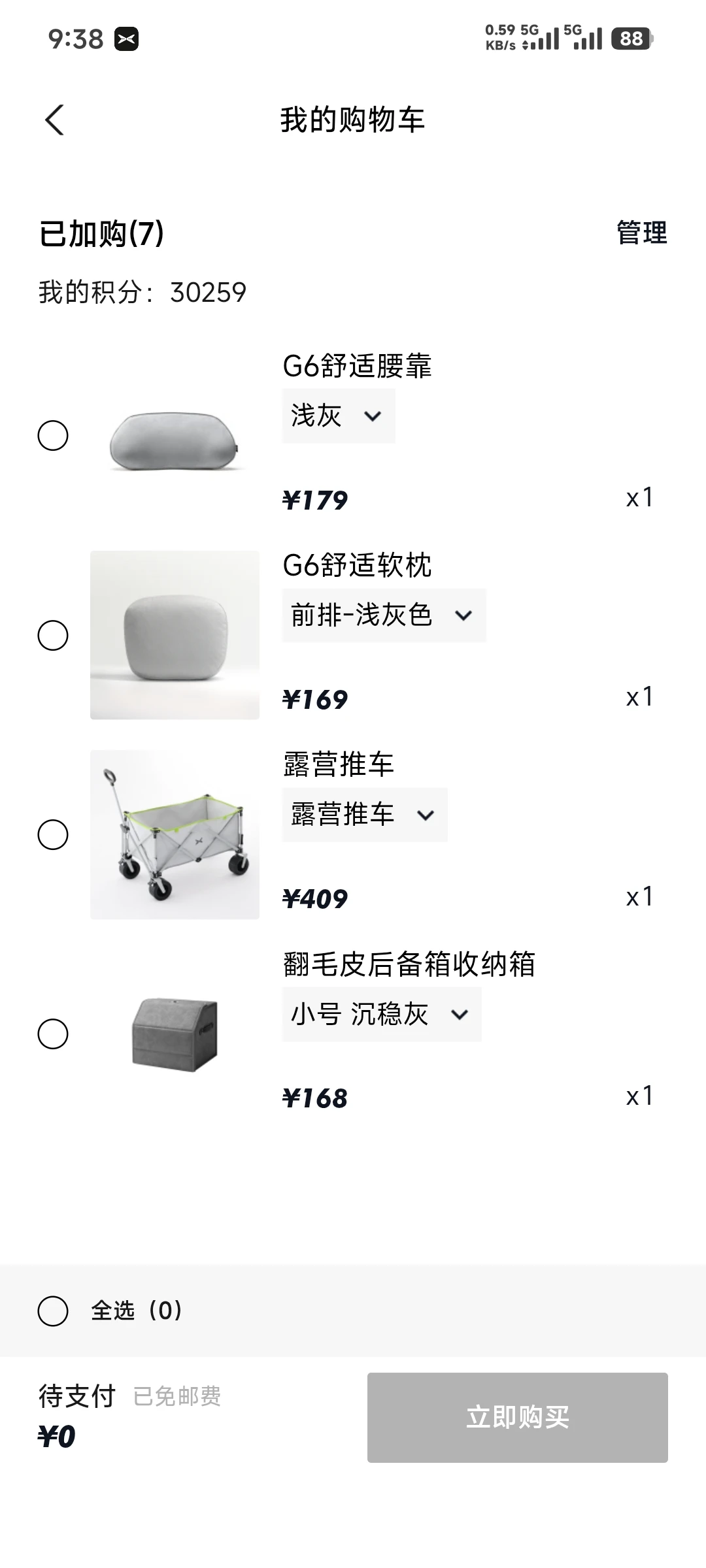 购物车里一眼心动又刚需的好物真的太多了。多功能应急安全锤集割刀、破窗、应急照明于一体,小巧不占地,关键时刻能救命,是每台车必配的安全神器;商务拉杆旅行箱质感在线、容量够用,出差旅行拎起就走,稳重又省心;车载交流放电插座完美适配户外用电,露营煮茶、给设备供电都不在话下,解锁 G6 外放电快乐;G6 舒适腰靠与软枕贴合人体曲线,长途开车腰不酸、颈不累,和原车内饰配色高度统一,高级感拉满;露营推车承重强、折叠方便,野餐装备一车拉走,轻松又治愈;翻毛皮后备箱收纳箱质感细腻、分区合理,让后备箱告别杂乱,整洁又显格调。