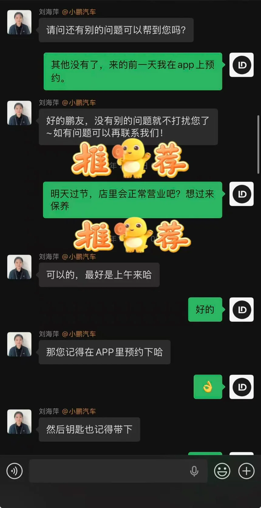 提前联系了我的服务管家,真是秒回复,提前和我沟通了我本次保养服务的内容还有注意事项,标记了日常用车的是否有其他问题🙋并详细记录📝,特别提醒⏰App预约,带好钥匙🔑,这样的服务谁能做到,把鹏友的事当作自己的事,太暖心了!