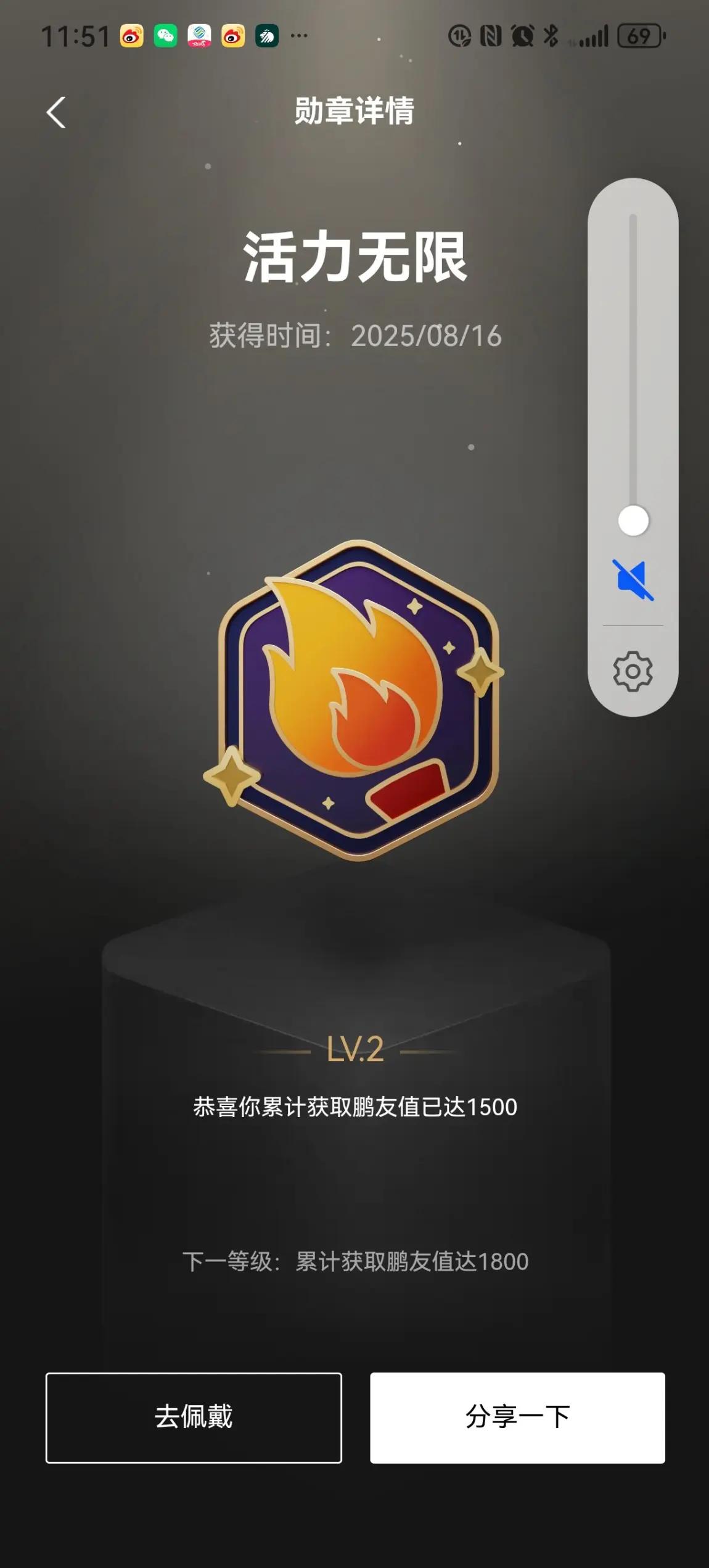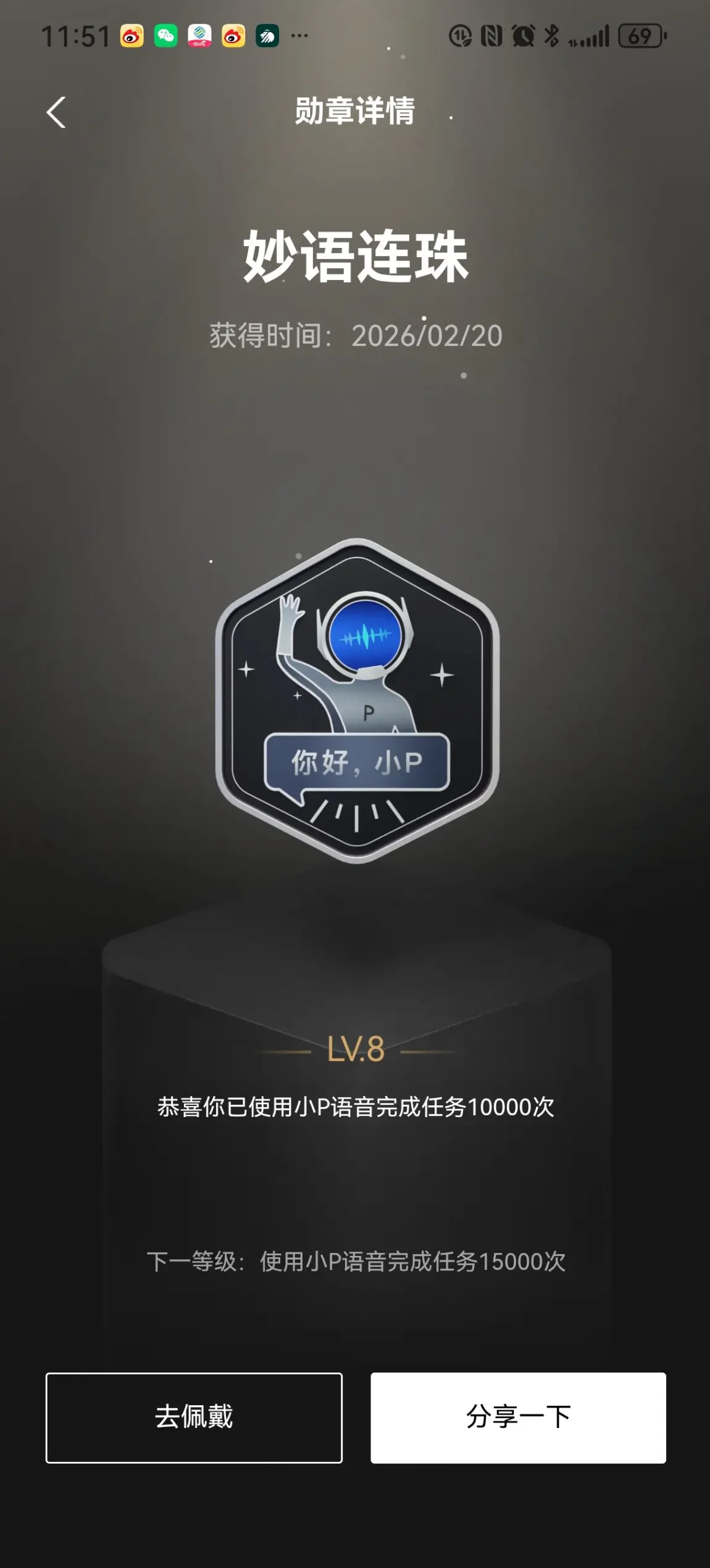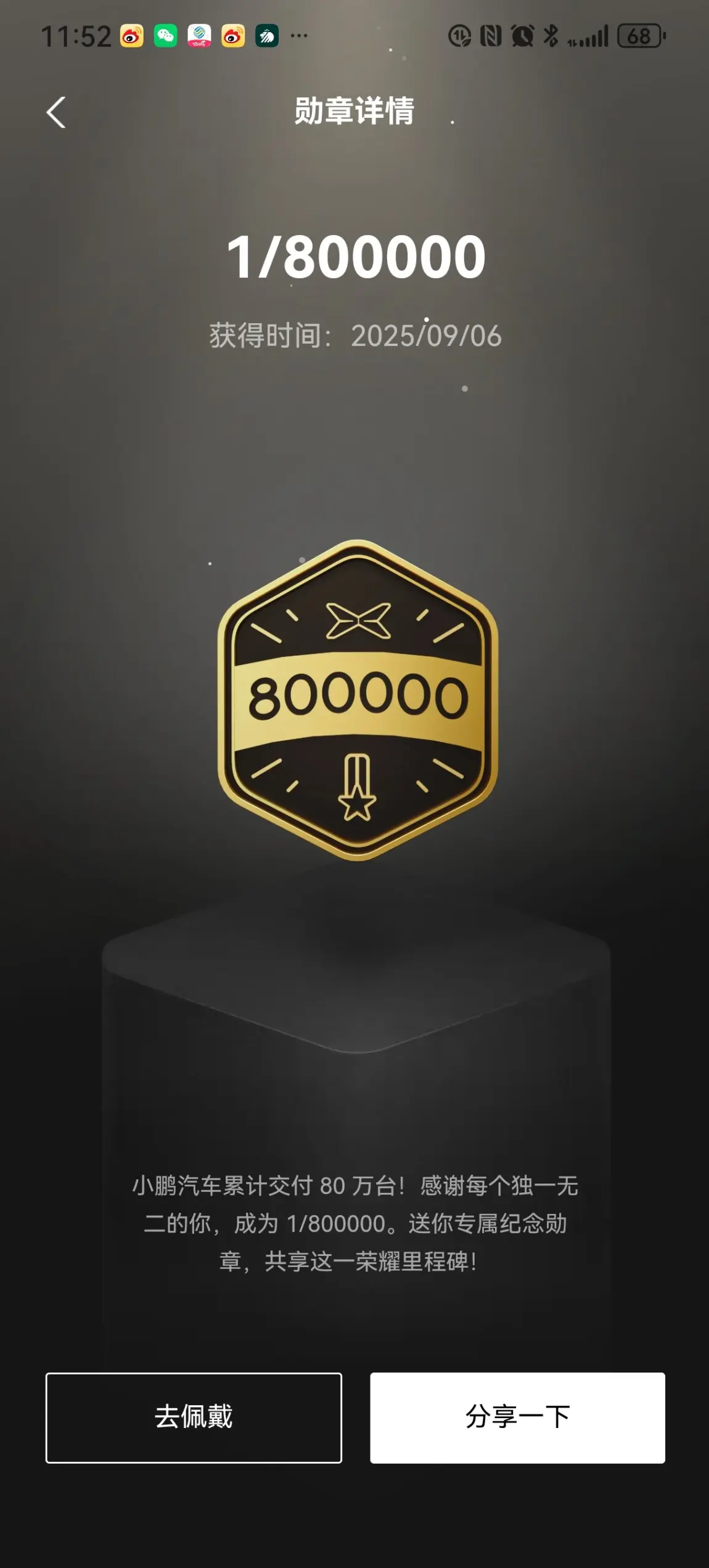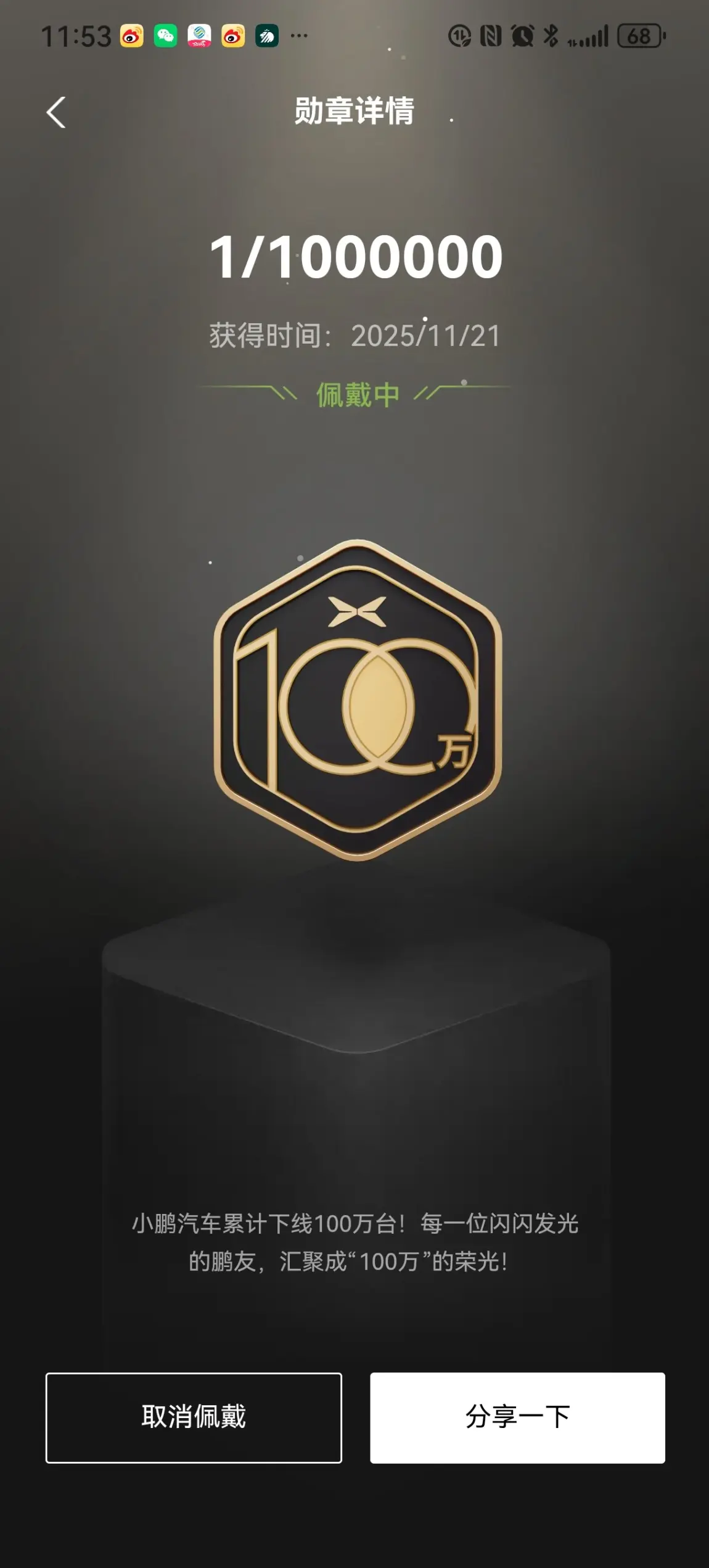 #晒晒我的勋章# 目前累计获得8枚勋章,佩戴的是小鹏累计下线100万台车勋章。个人觉得挺有纪念意义。也很荣幸能加入鹏友大家庭!妙语连珠勋章也不错,没事就和小P聊聊天,也是个话搭子!