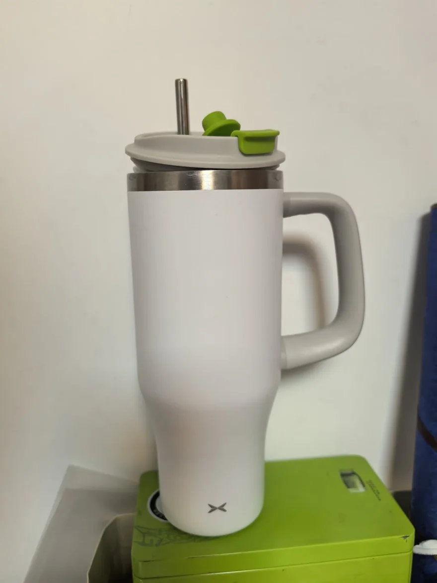 白绿配色清新又耐看,带把手和吸管,大容量设计太适合长途自驾了,保温效果在线,杯身X标低调有质感,通勤、露营都能喝上热饮。