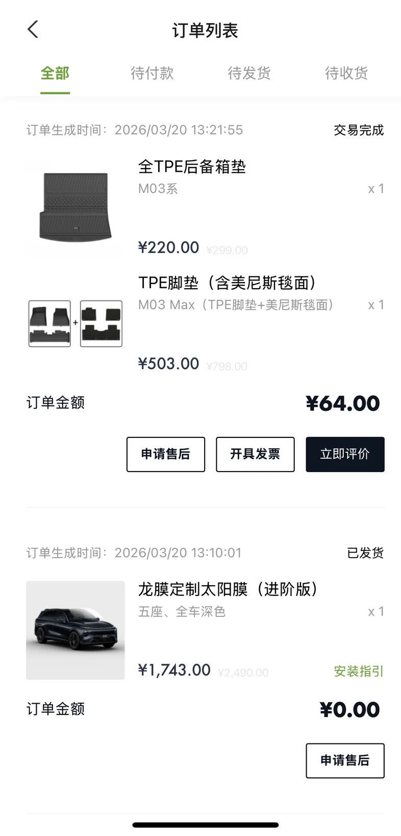 最先安排的是刚需三件套——龙膜太阳膜,定制脚垫、后备箱垫。尺寸严丝合缝,做工扎实,最关键是完全没有刺鼻异味,用料很环保,质感和贴合度都比淘宝杂牌好太多,用着特别安心。新车主有打折,很赞