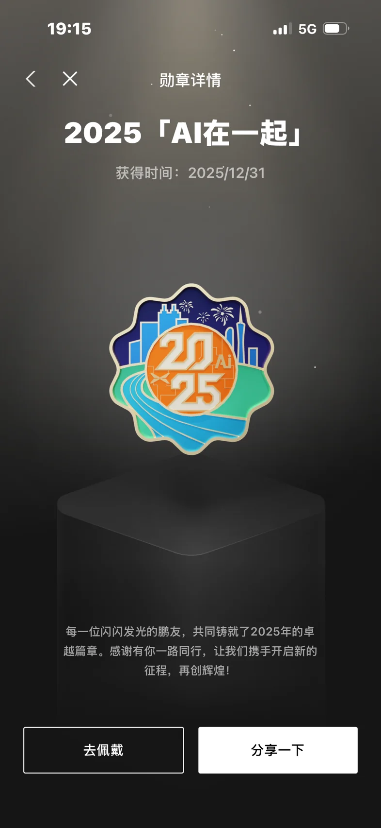 它纪念2025年小鹏与我在一起的一年里,传递“科技有温度、陪伴共成长”的理念,也是我的一枚专属的“年度出行记忆徽章”。• 它是“年度里程碑”的见证:年末颁发,即总结2025年小鹏与我的“AI出行探索”,也象征“告别旧岁、开启新程”的仪式感——感谢一路同行,为2026年的新征程埋下伏笔。