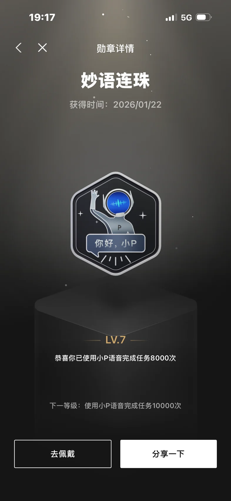 这枚「妙语连珠LV.7」勋章,是我与小P(小鹏语音助手)之间“高频互动+深度信赖”的鲜活见证。未来,随着小鹏的XNGP、AI大模型进一步进化,这枚勋章的故事还会延续——或许下一次,你会和小P完成10000次任务,解锁更高等级,而“人车AI共生”的美好,也会在更多交互中绽放。