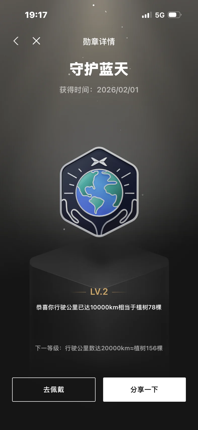 这枚勋章也很有意义。现在我已经行驶了1.4万多公里了,相当于我植树100多颗啦。小鹏作为新能源品牌,“守护蓝天”是核心主张。这枚勋章不仅是“里程记录”,更是“我与小鹏共享绿色价值观”的证明——我选择的不仅是一辆车,更是一种低碳生活方式,而品牌用勋章把这种“隐形贡献”可视化,让我感受到“每一次出发都有环保意义”。