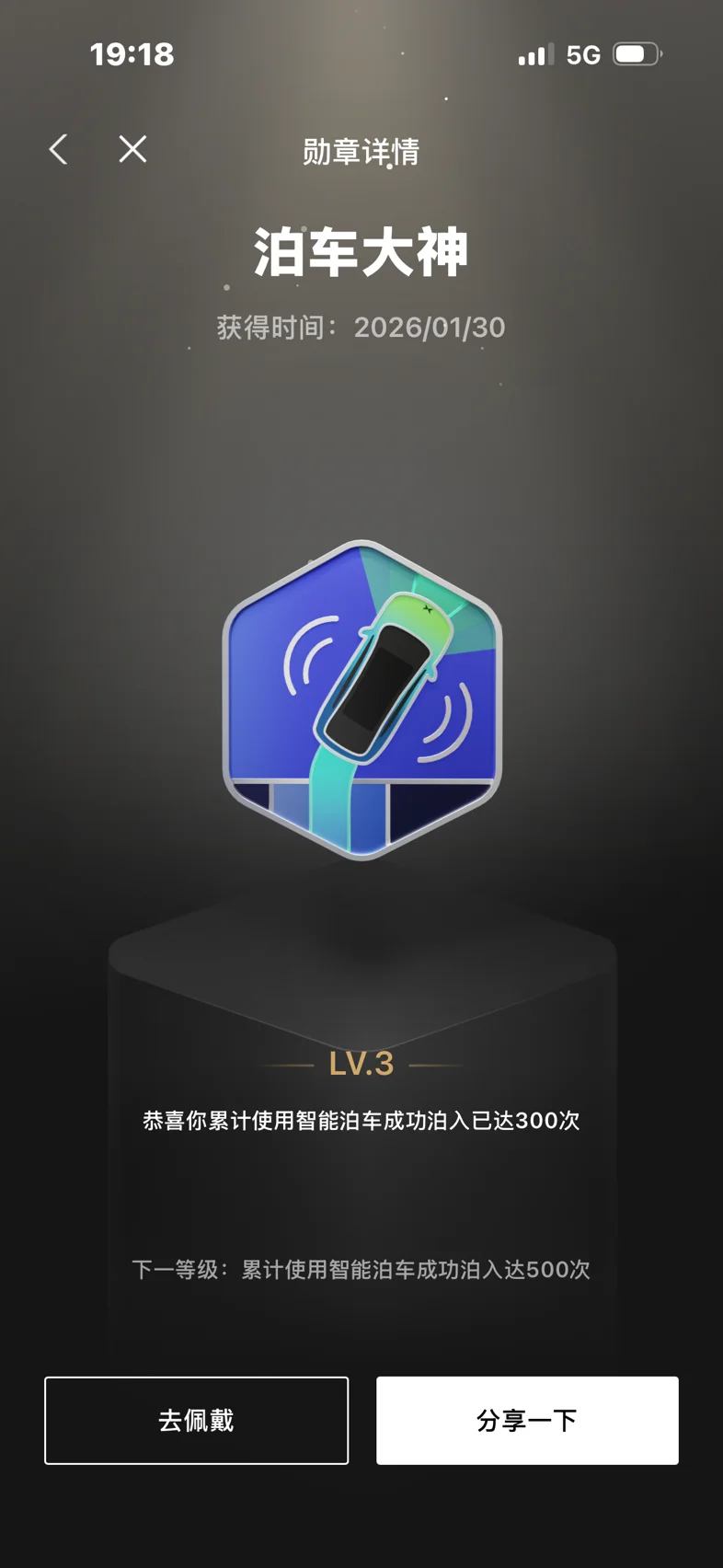 这枚「泊车大神LV.3」勋章,是我“回家必用自动泊车”所得到的荣誉称号。是我“把智能科技过成日常,把人车互动变成默契,把功能使用变成品牌共建”的生动见证。它记录的不仅是“300次泊车”,更是我与小鹏在“智能出行时代”里,“相互陪伴、相互成就”的生活切片。