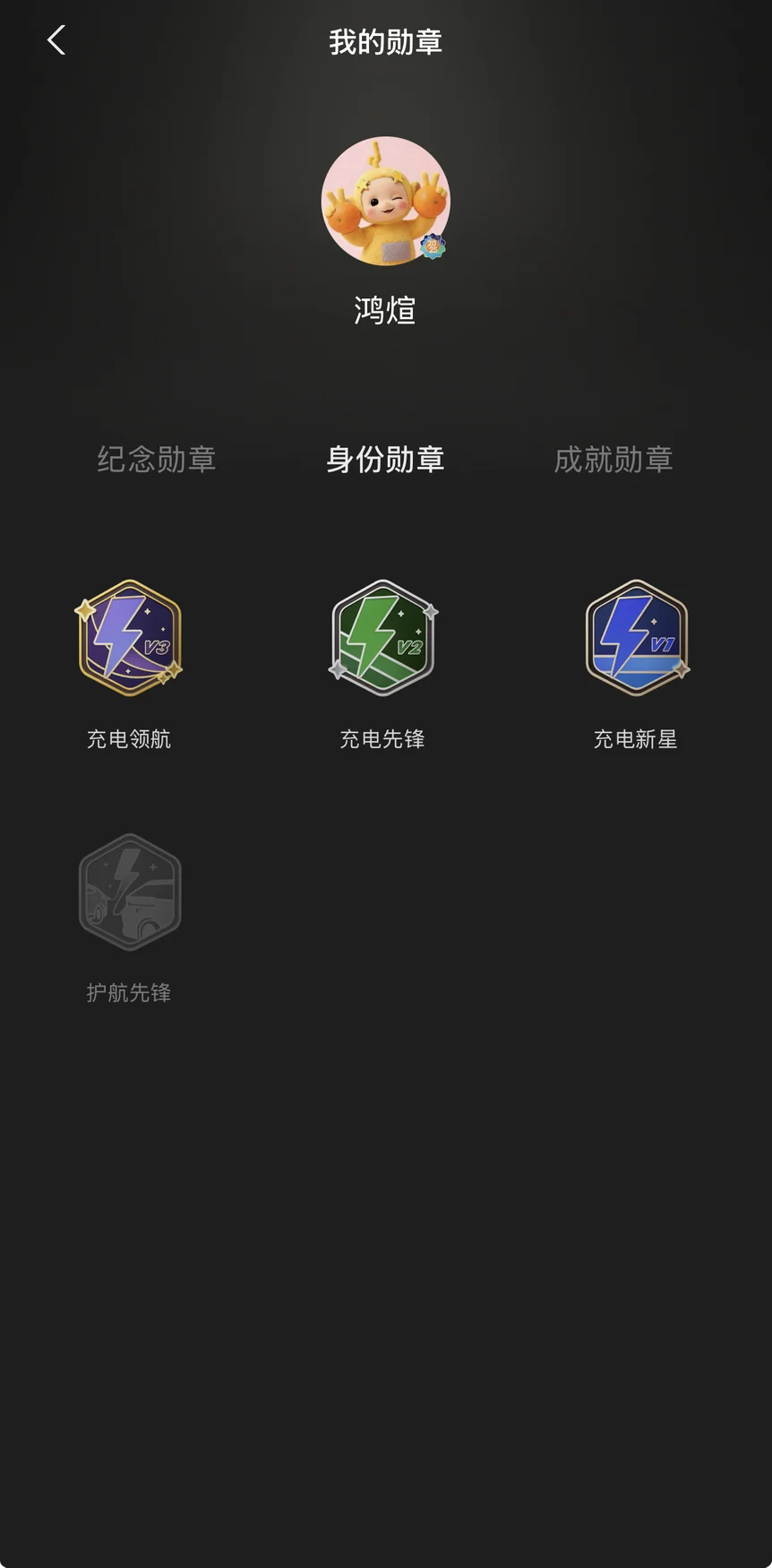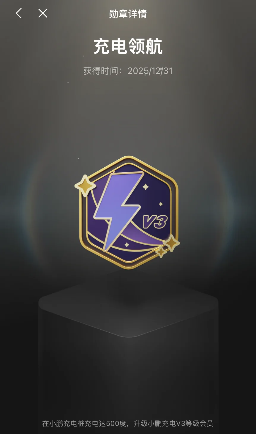 身份勋章方面,充电系列从「充电新星」一路升级到「充电领航」,见证了我从新手到老司机的蜕变。V3 的紫色闪电设计太帅了,在超充站经常被人问怎么获得的😎