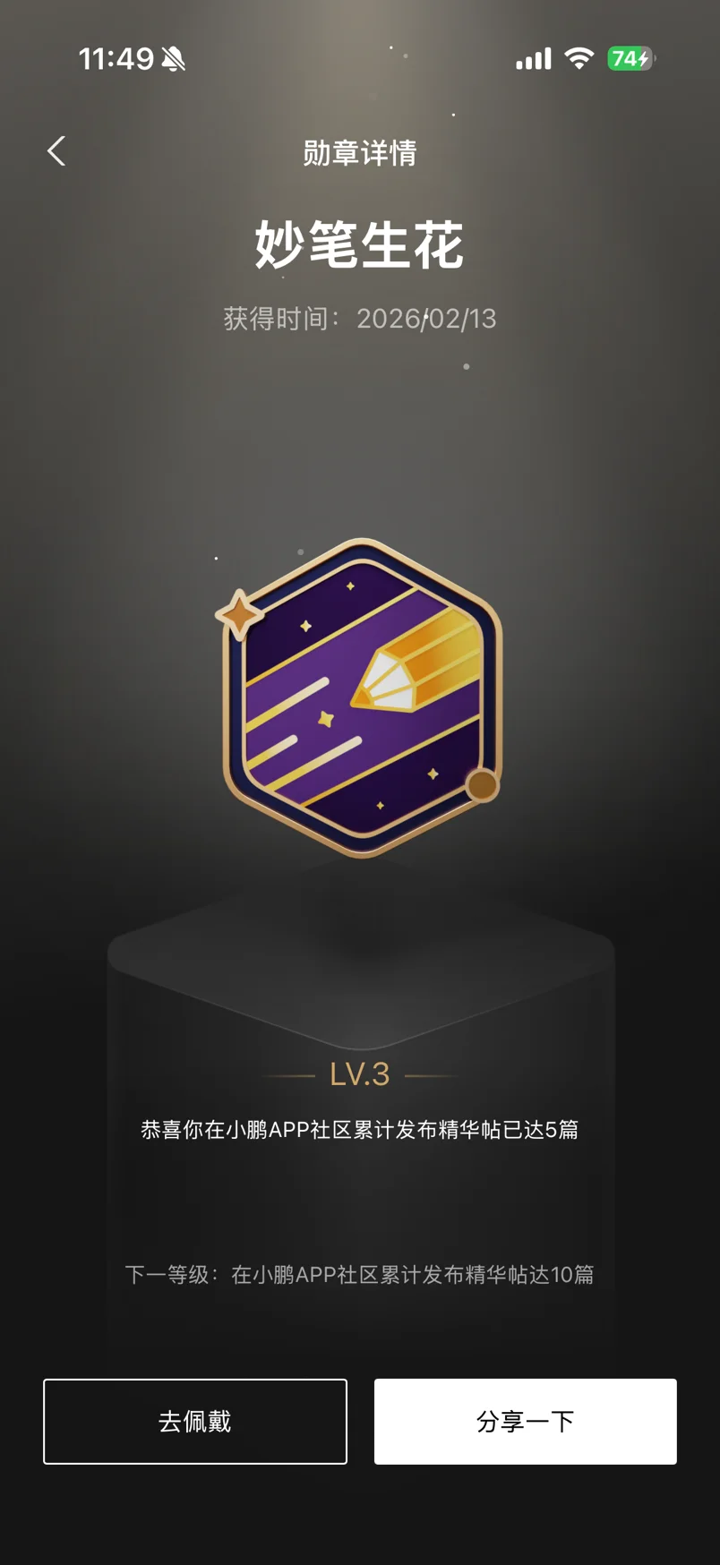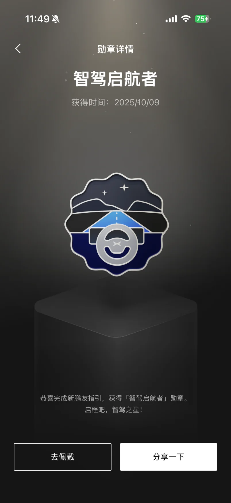 从提车开始,获得第一枚勋章的好奇,到后面一步一步解锁更多的勋章,我可以肯定勋章带给鹏友的不止是情绪价值,更是见证了每个鹏友的成长史。我拿我的勋章举例,我当初买车考虑小鹏的第一因素就是智能化,所以提车当天马不停蹄完成了考试和指引,开始智驾获得了启航者勋章。