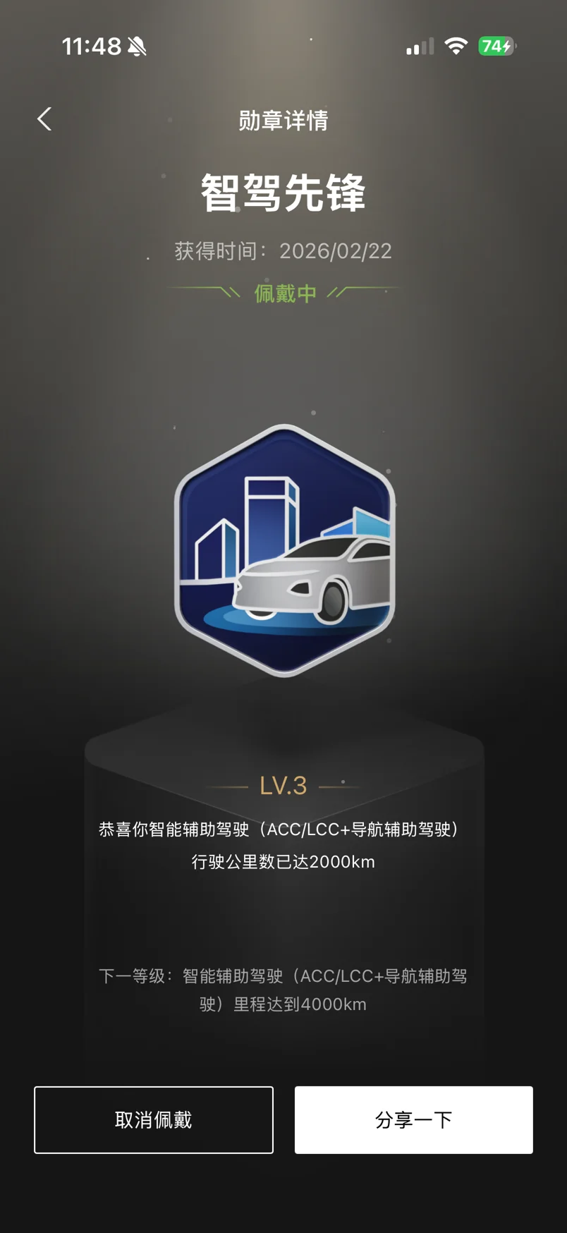 慢慢的对智驾的使用越来越娴熟,对他的边界也越来越了解,就可以更加放心的把车完全交给他开,对智驾的使用也是信手拈来,很快我拿到了我的智驾第二枚勋章智驾先锋,当时还跟我的朋友炫耀了好久,非常骄傲。