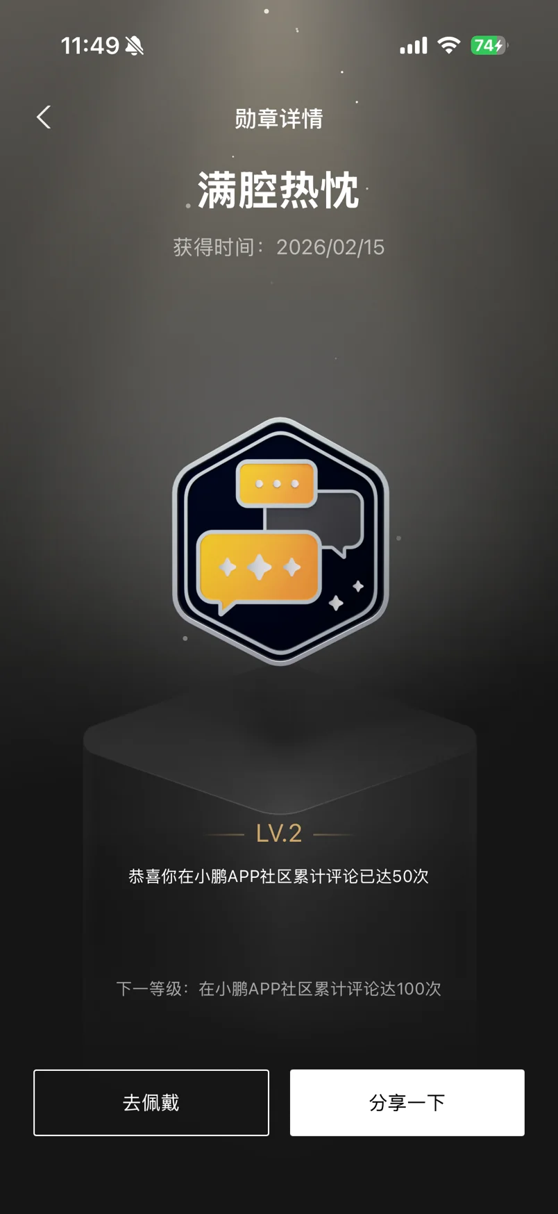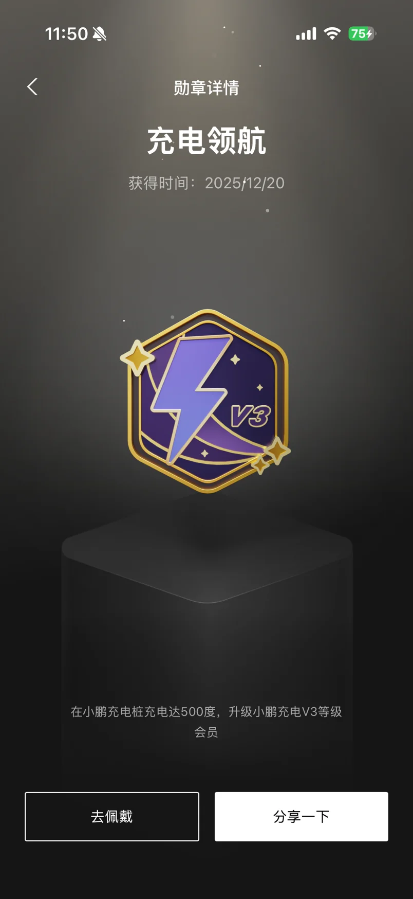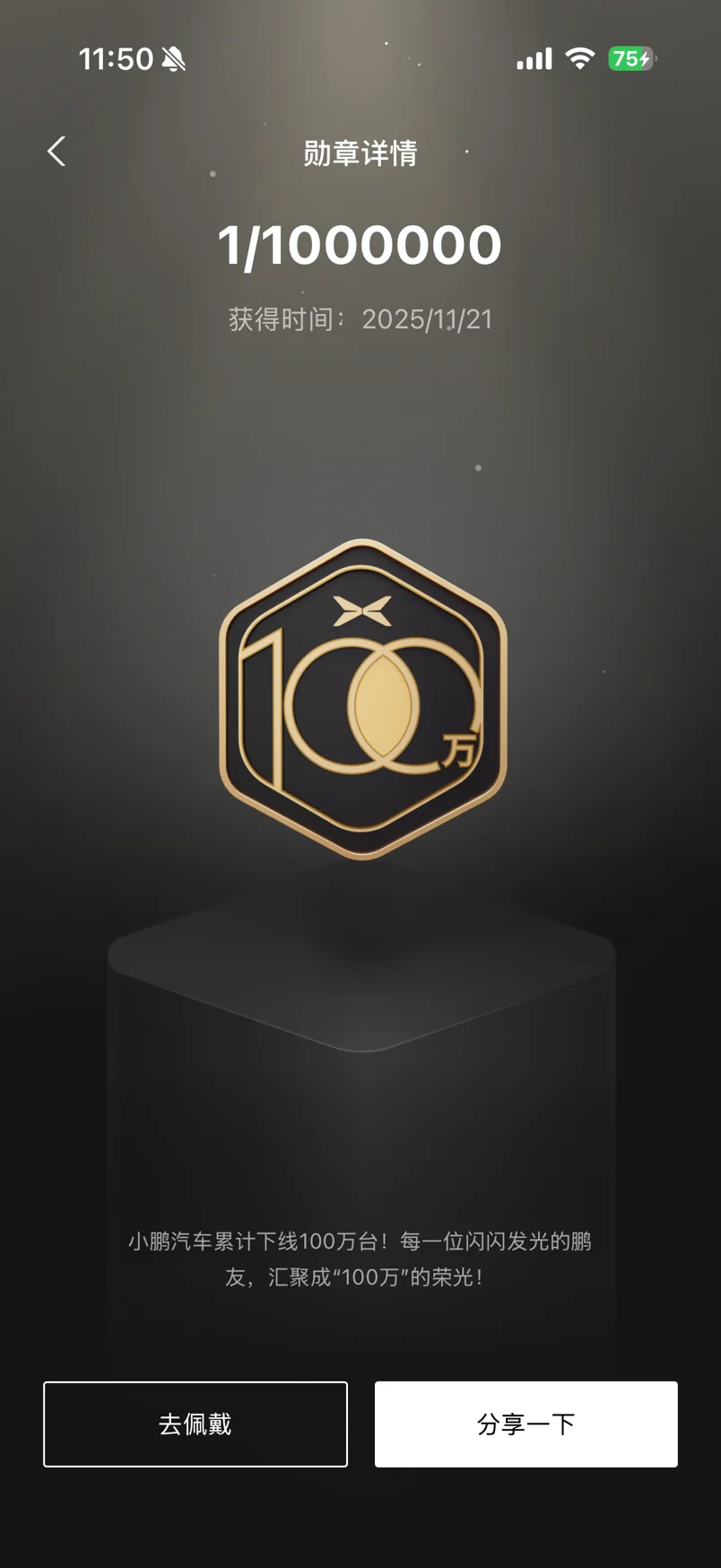 同时也很有幸成为小鹏100万车主的一份子,拿到了100万荣光勋章🎖️,希望以后可以接着拿200万勋章🐶。