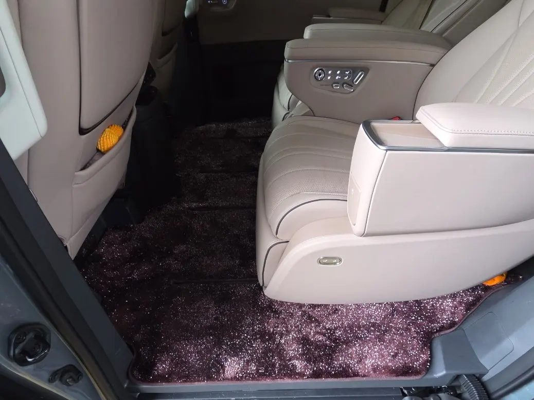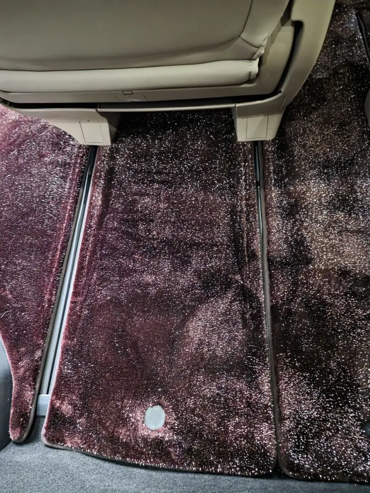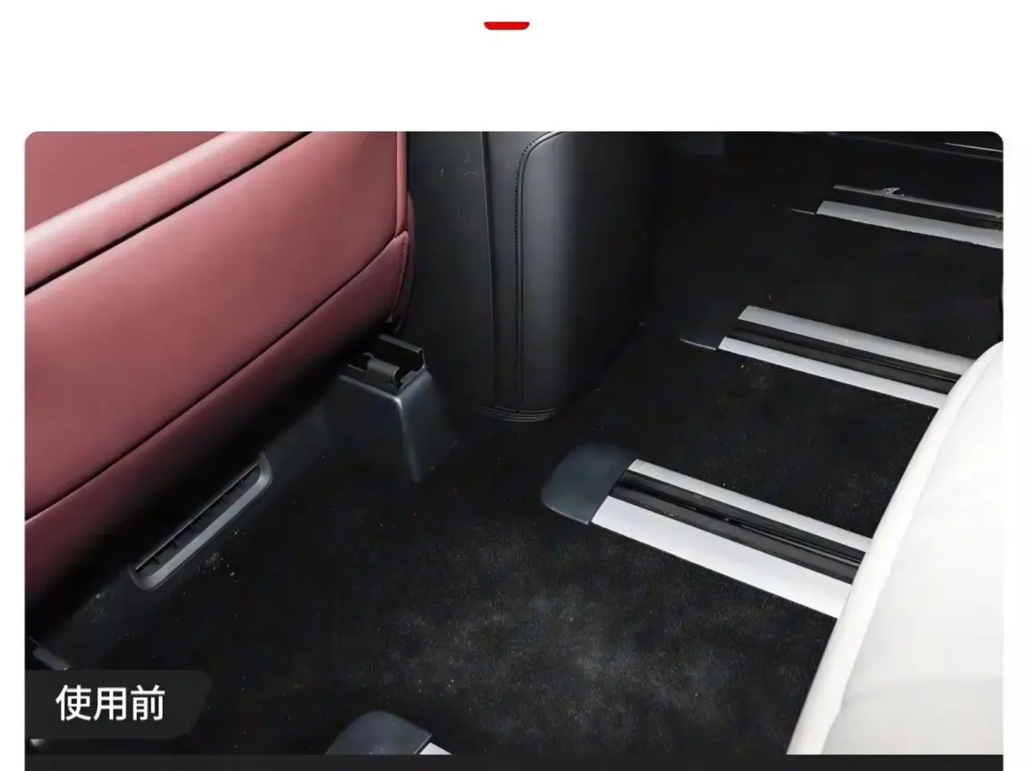 对比改装地板,不论是有轨还是无轨,强烈建议小鹏把原厂脚垫换成这种。有轨的地板不能遮住轨道缝隙,无轨地板其实还是有轨道,只是换成短轨了,而且从第三排能看到是安装在地板上的。