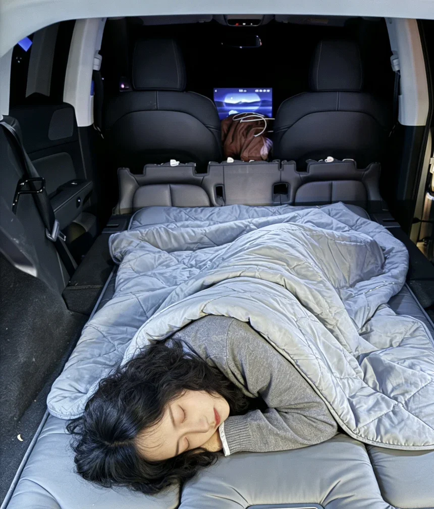更贴心的是它的休憩模式,开车到山野、湖边想歇一歇,打开模式座椅自动调节角度,配合大天幕,抬头就是蓝天绿树,瞬间放松下来。最让我心动的还是座椅放倒成床的设计,前排和后排连通能铺出1.8m的舒适大床,不用额外装气垫,平整度超棒,露营过夜躺着完全不硌腰,天幕双层镀银玻璃还能隔绝99.9%紫外线,白天休息也不晒。