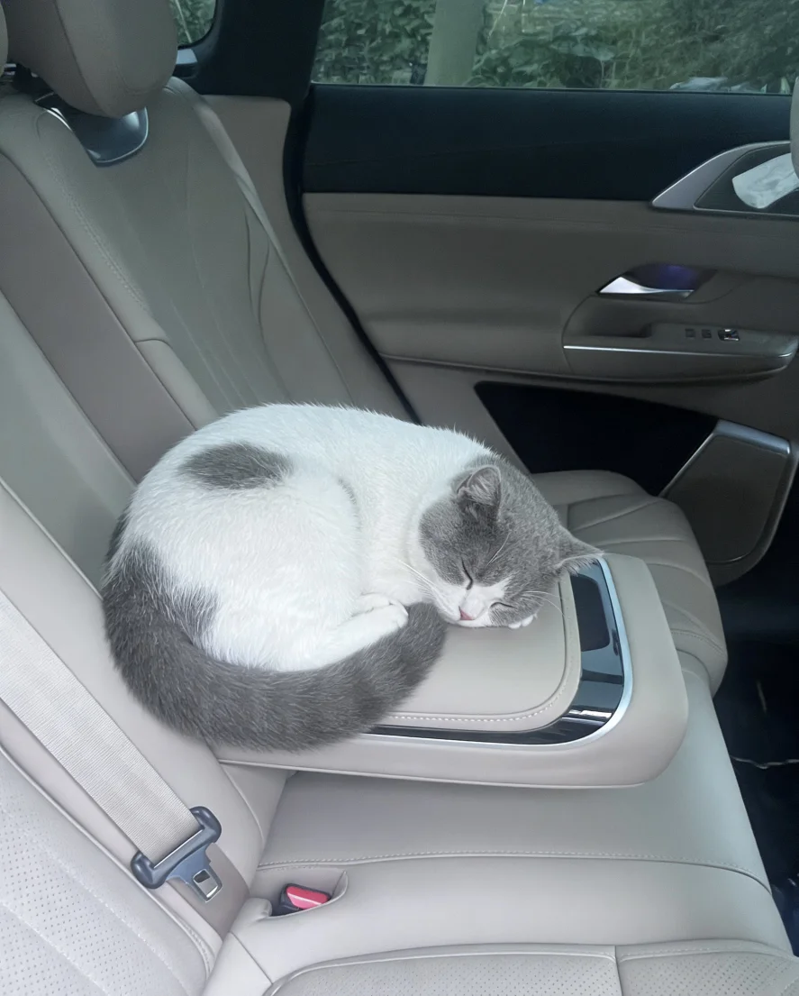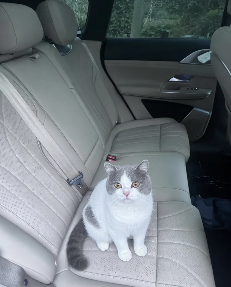 宽敞的后排座椅简直是猫咪的专属「头等舱」,打孔真皮透气又亲肤,主子随便坐卧都自在,完全没有局促感~