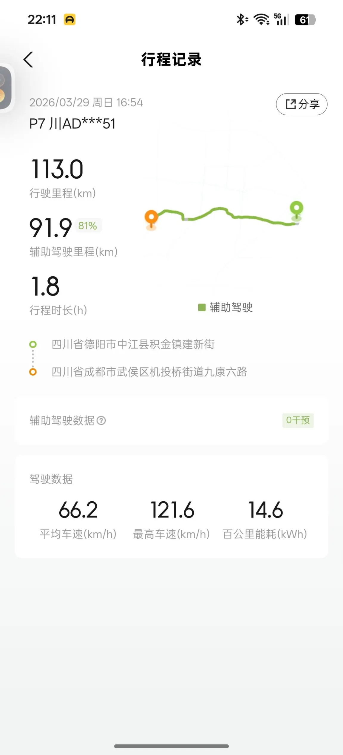 这14.6kw的百公里能耗是用五年15万公里的小鹏P7跑的,其中有80公里高速用辅助驾驶全程顶到120公里,还三十多公里是山路和城市道路。五年的老车还是很满意了[耶]